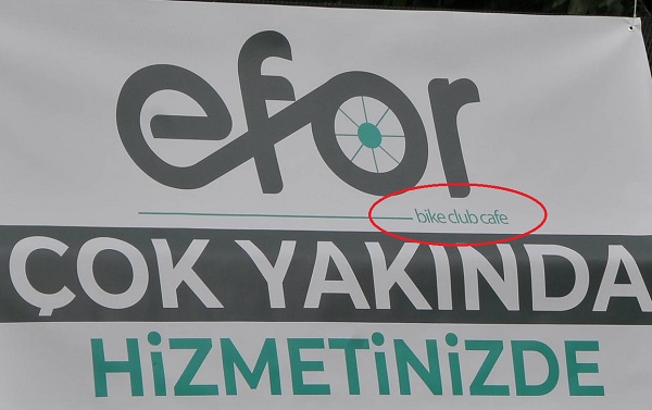 Konteyner tarzı büfeye asılan “yakında açılıyoruz” pankartındaki “bike clup cafe” (bisiklet kulüp cafe) yazısı ilgi çekti.