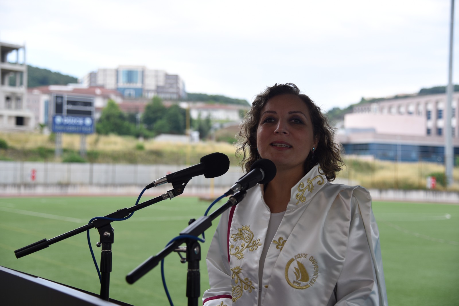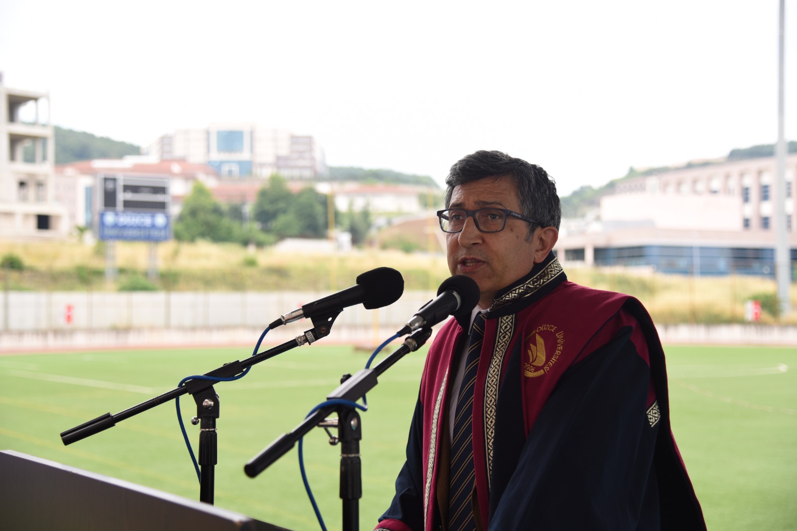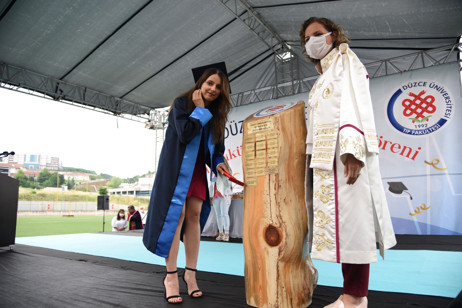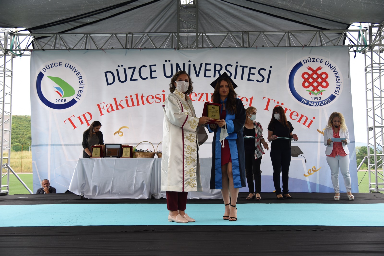 Covid-19 tedbirleri kapsamında Düzce Üniversitesi Stadyumu’nda düzenlenen programa; Düzce Üniversitesi Rektörü Prof. Dr. Nigar Demircan Çakar, Rektör Yardımcısı ve Tıp Fakültesi Dekanı Prof. Dr. İdris Şahin, Rektör Yardımcısı Prof. Dr. Mehmet Akif Öncü, Düzce Üniversitesi Hastanesi Başhekimi Prof. Dr. Öner Abidin Balbay, öğretim üyeleri ile mezun olan öğrenciler ve aileleri katıldı.