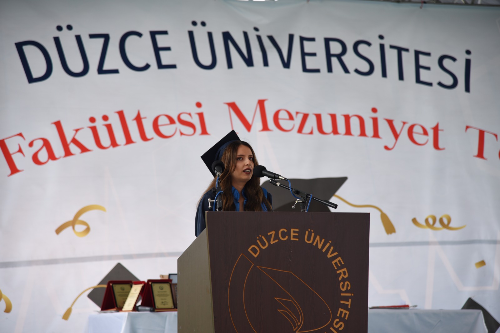 Mezuniyet töreninin açılış konuşmasını gerçekleştiren 2020-2021 Akademik Yılı Dönem Birincisi Dr. Nazmiye Çağla Badur, çocukluğundan beri hayalini kurduğu, uzun, yorucu, meşakkatli 6 yıllık Tıp Fakültesi eğitim hayatının sonuna geldiğini belirterek maddi manevi desteklerini her zaman hissettikleri ailelere teşekkür etti. Hastanenin her biriminde görev aldıklarını ve Düzce Üniversitesi Hastanesi’nde verilen sağlık hizmetinin önemli bir yapı taşı haline geldiklerini söyleyen Badur, pandemi sürecinde eğitim hayatlarının en zor yılını geçirdiklerini belirterek, bu süreçte aile hayatından uzak kalan ve bu uğurda canlarını feda eden tüm sağlık çalışanlarını rahmet ve minnetle andığını sözlerine ekledi. Hekimliğin kutsallığını ve gururunu 132 dönem arkadaşıyla ömür boyu taşıyacaklarını dile getiren Dr. Nazmiye Çağla Badur, sağlık çalışanlarına yönelik şiddetin son bulması temennisiyle sözlerini sonlandırdı.