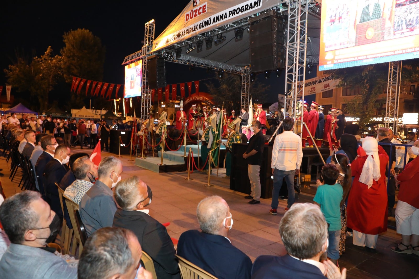 Duaların edildiği, Kur’an-ı Kerimin okunduğu meydanda yüzlerce kişi ellerinde Türk bayraklarıyla darbe girişimini lanetleyerek şehitleri andı. Programa Düzce Valisi Cevdet Atay, Düzce Belediye Başkanı Dr. Faruk Özlü, milletvekilleri, kamu kurum kuruluş müdürleri, sivil toplum örgütü başkanları ve 7’den 70’e yüzlerce vatandaş katıldı.