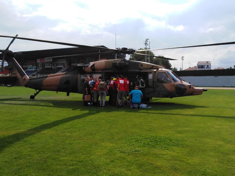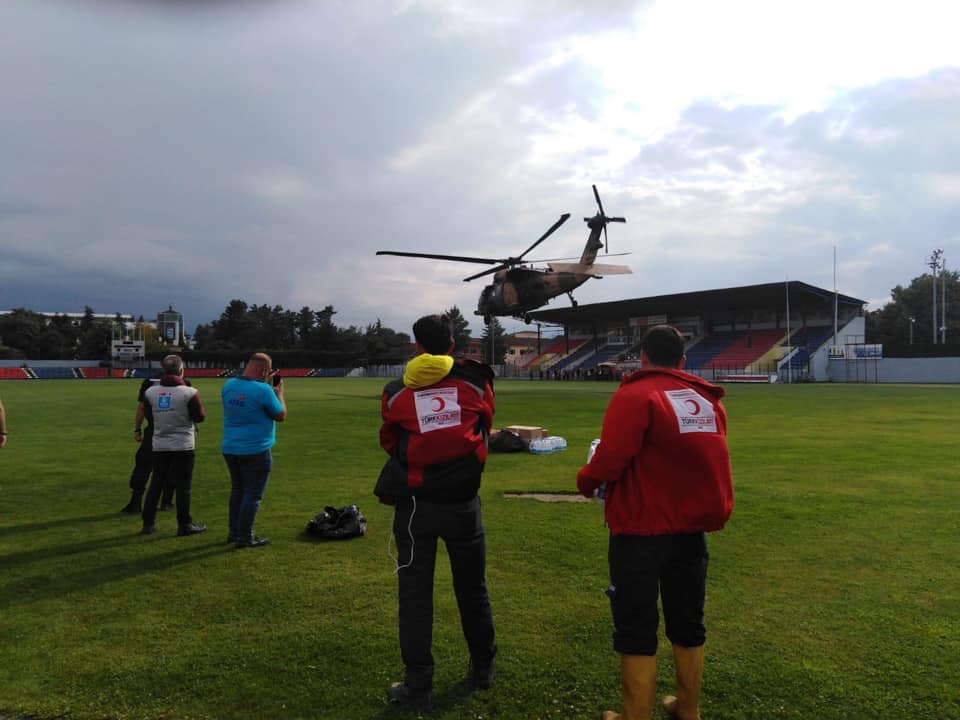 Türk Kızılayı, Düzce’de kuvvetli sağanak ve heyelan nedeniyle kara yoluyla ulaşım sağlanamayan bölgeye helikopterle yardım götürdü.