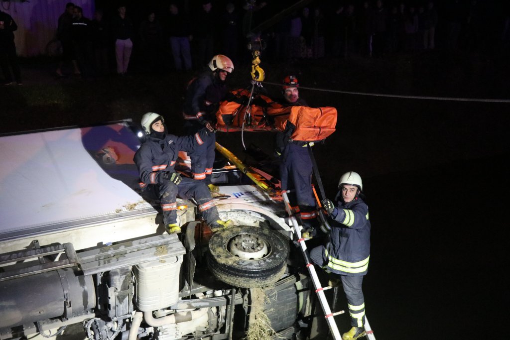 Düzce’de dere yatağına devrilen kamyonun sürücüsü, sıkıştığı yerden itfaiye ekiplerince çıkarıldı.