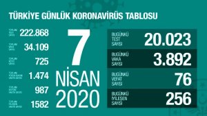 Sağlık Bakanı Fahrettin Koca, yeni tip koronavirüste (Kovid-19) son 24 saatte vaka sayısının 3 bin 892, vefat sayısının 76 olduğunu, toplam vefat sayısının 725’e ulaştığını bildirdi.