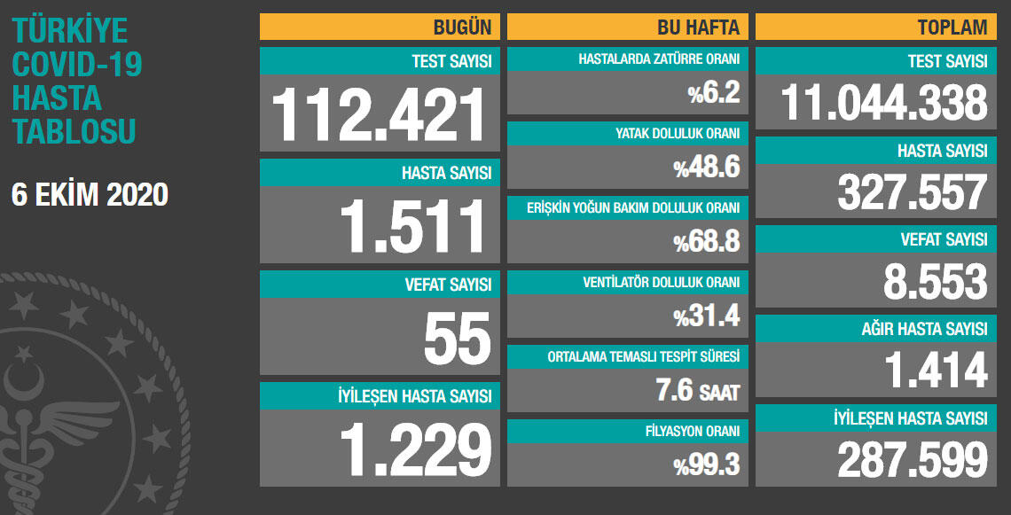 Sağlık Bakanlığı, 6 Ekim Türkiye Günlük Korona Tablosu’nu paylaştı. Tabloya göre, son 24 saatte 112 bin 421 Kovid-19 testi yapıldı, 1511 kişiye hastalık tanısı konuldu, 55 kişi Kovid-19 nedeniyle hayatını kaybetti, ağır hasta sayısı 1414 oldu.