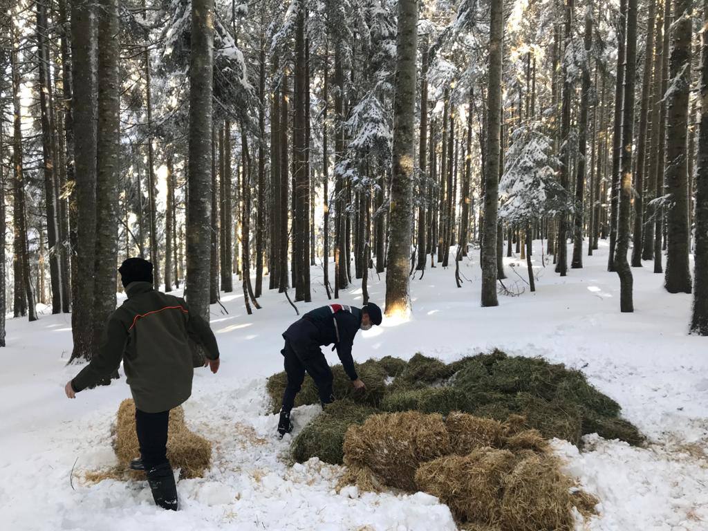 Düzce Doğa Koruma ve Milli Parklar Şube Müdürlüğü, Beyköy Jandarma Karakol Komutanlığı ile birlikte Beyköy ormanlarında yaban hayatına destek olmak için 150 kg yonca ve 50 kg saman doğaya bıraktı.
