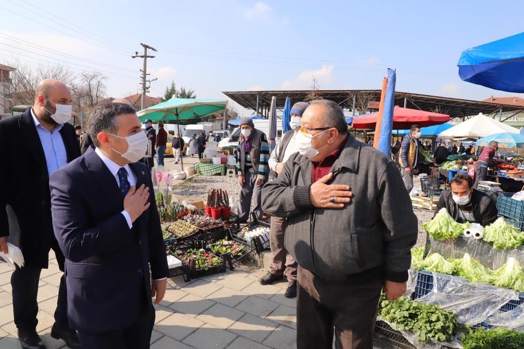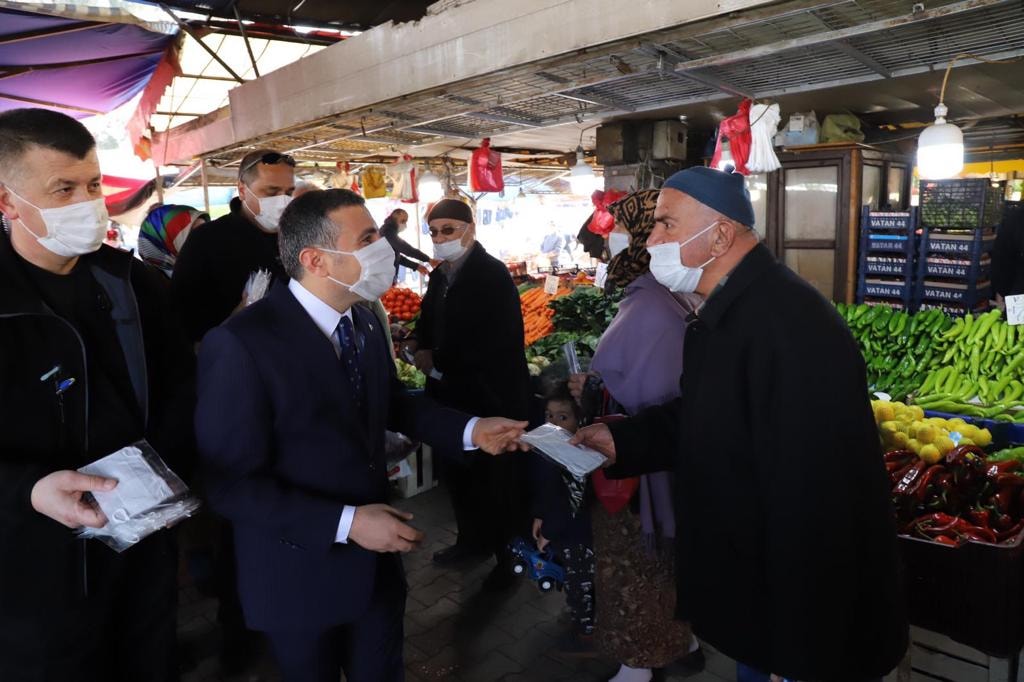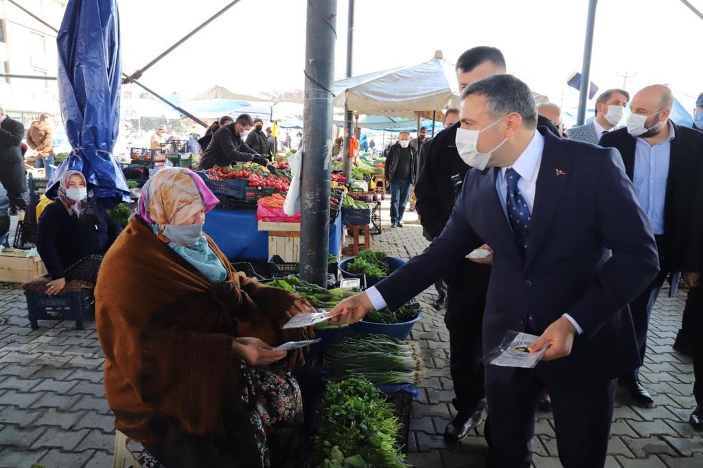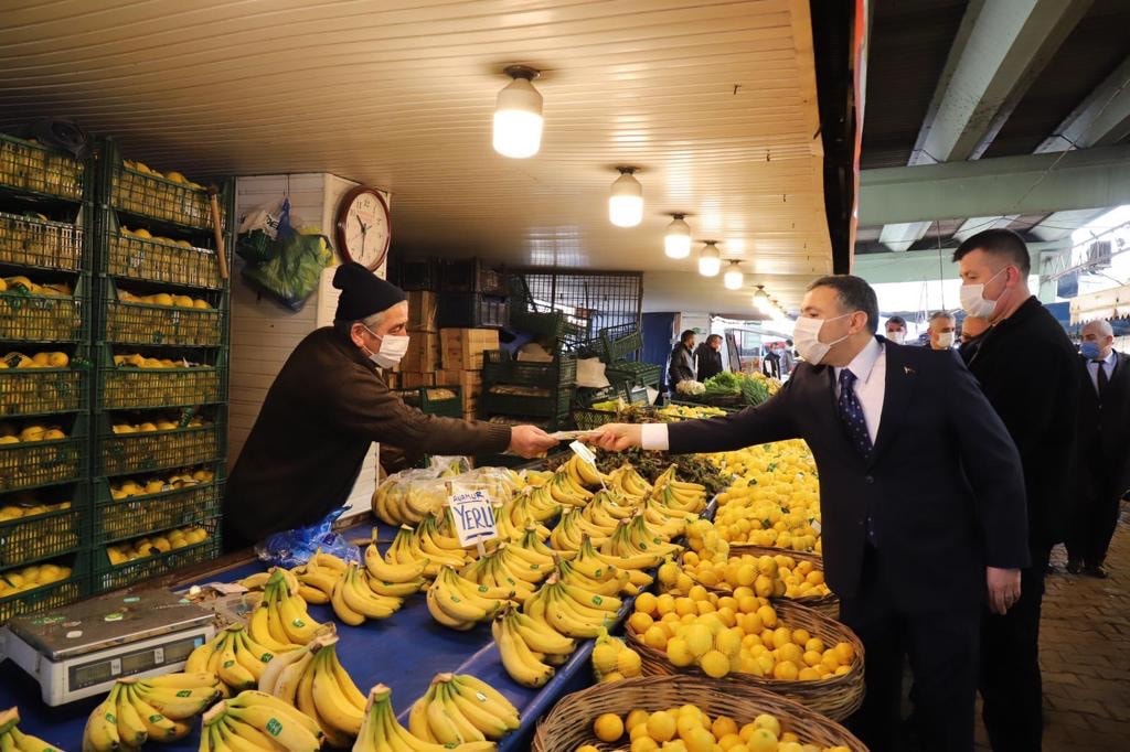 Vatandaşlara maske dağıtan Atay, pazarcı esnafından alışveriş yaptı.