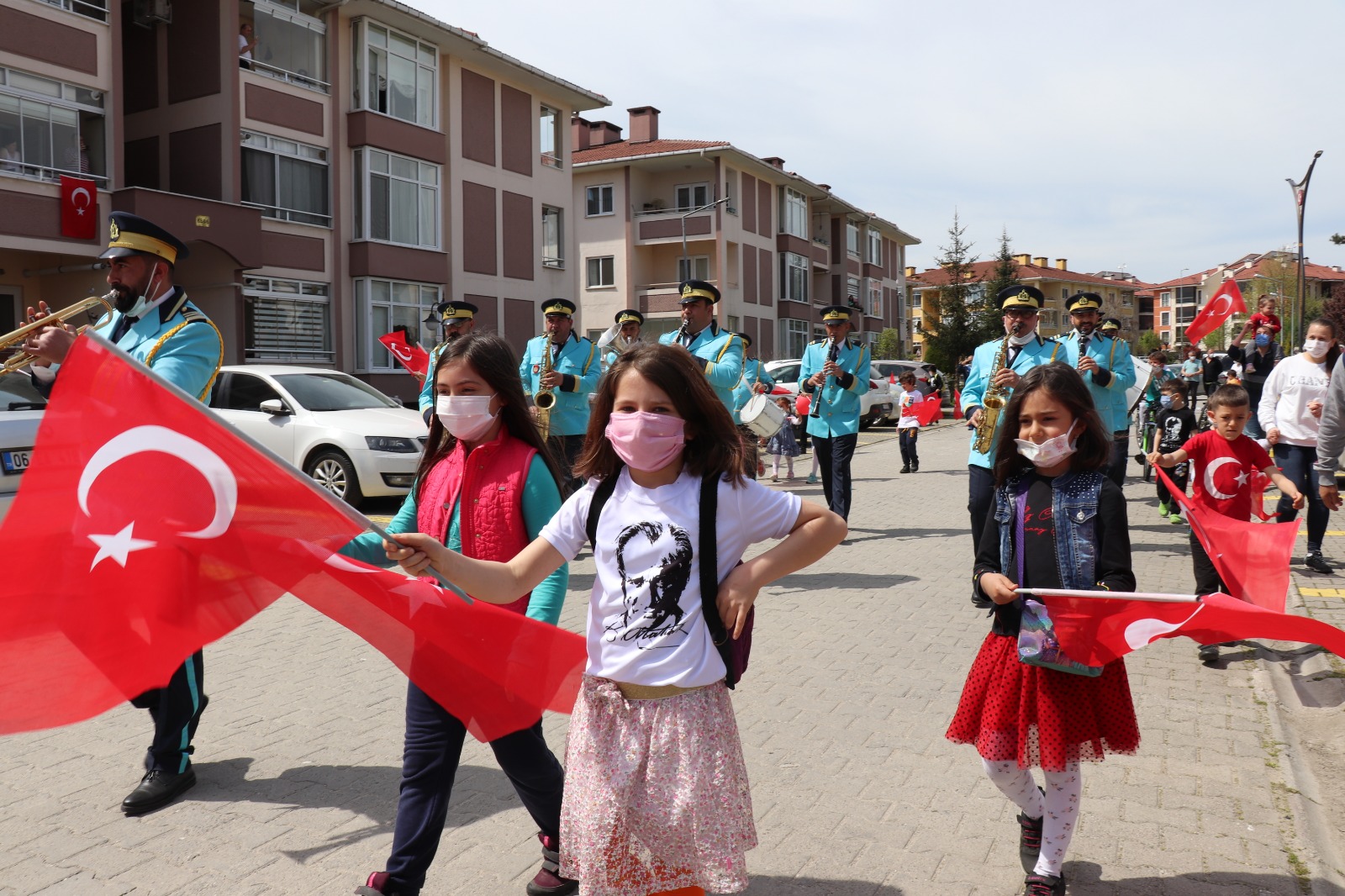 Türk Bayrakları ile Belediye Bandosuna eşlik eden çocuklar ve veliler, pandemi dolayısıyla 23 Nisan Ulusal Egemenlik ve Çocuk Bayramını ayaklarına kadar getiren Düzce Belediyesine teşekkür etti.