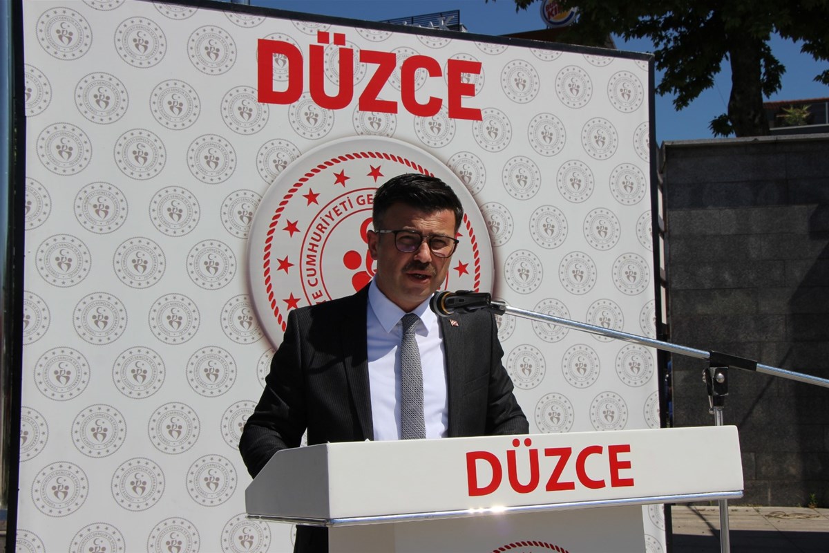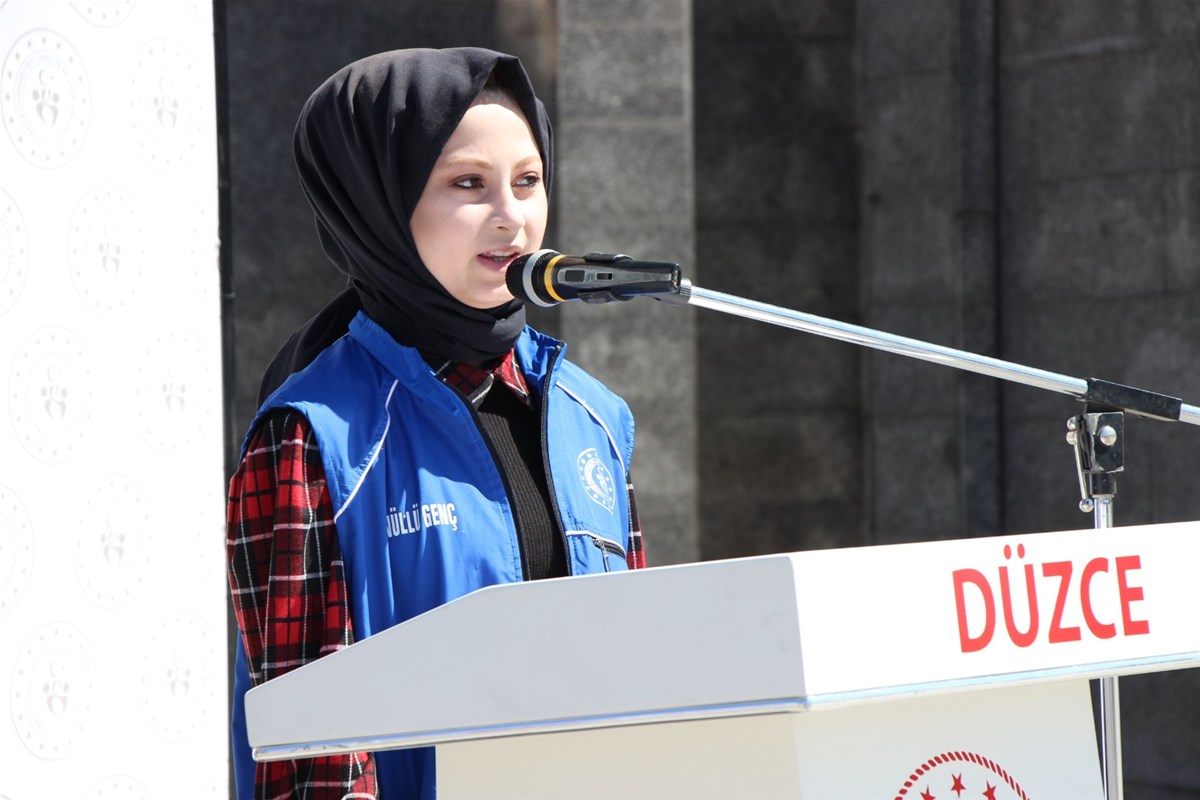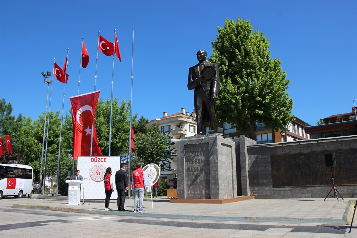 Düzce il Gençlik ve Spor Müdürü İsa yazıcı törende yaptığı konuşmada 19 Mayıs’ın önemini vurgulayarak; “İstiklal Savaşımızın başlangıcını simgeleyen 19 Mayıs 1919; esareti kabul etmeyen, hürriyetinden vazgeçmeyen, hiçbir zorluğa boyun eğmeyen Aziz Milletimizin var olma mücadelesinin ilk adımıdır. Gazi Mustafa Kemal Atatürk’ün 19 Mayıs 1919 tarihinde Samsun’da başlattığı bağımsızlık mücadelesi, tarihe gömülmek istenen bir milletin küllerinden tekrar doğuşunun ilk adımıdır. Bu ilk adımda yakılan ’İstiklal Meşalesi’ Amasya, Erzurum ve Sivas’tan geçerek elden ele, dilden dile tüm vatana yayılmış, nihayetinde destanlaşan bir kurtuluş mücadelesine dönüşmüştür. Esaret altındaki mazlum milletlere de ışık olan bu kurtuluş mücadelesiyle Aziz Milletimiz; vatan ve bayrak sevgisini ve özgür yaşama kararlılığını tüm dünyaya bir kez daha ilan etmiştir. İstiklal Savaşımızı zafere taşıyan birlik, beraberlik ve dayanışma ruhu, bize gelecek günler için ilham ve güç vermektedir. Geleceğimizin teminatı sevgili gençler; Gazi Mustafa Kemal Atatürk, ’Ey yükselen yeni nesil, gelecek sizindir. Cumhuriyet’i biz kurduk; onu yükseltecek ve yaşatacak olan sizlersiniz’ diyerek sizlere olan güvenini ve inancını göstermiştir. Sizler, ecdadımızdan aldığınız ilhamla Türkiye Cumhuriyeti’ni aydınlık yarınlara taşıyacak, dünyaya örnek olacak ve milletçe hepimizi gururlandıracak çalışmalara imza atacak güce ve vizyona sahipsiniz. Bu vatan, bu bayrak, bu bayram sizindir ve sizlere emanettir. Bu emanete sonsuza dek sahip çıkacağınıza, Şanlı Bayrağımızı daima en yüksekte dalgalandıracağınıza inancımız tamdır. Cumhuriyetimizin emanetçisi, bugünün ortakları, gençlerimizdir. Sizlerin yüzlerindeki ışıkta, gözlerindeki pırıltıda her geçen gün daha da güçlenen Türkiye’mizin aydınlık geleceğini görüyor, gençlerimize güveniyoruz” dedi.