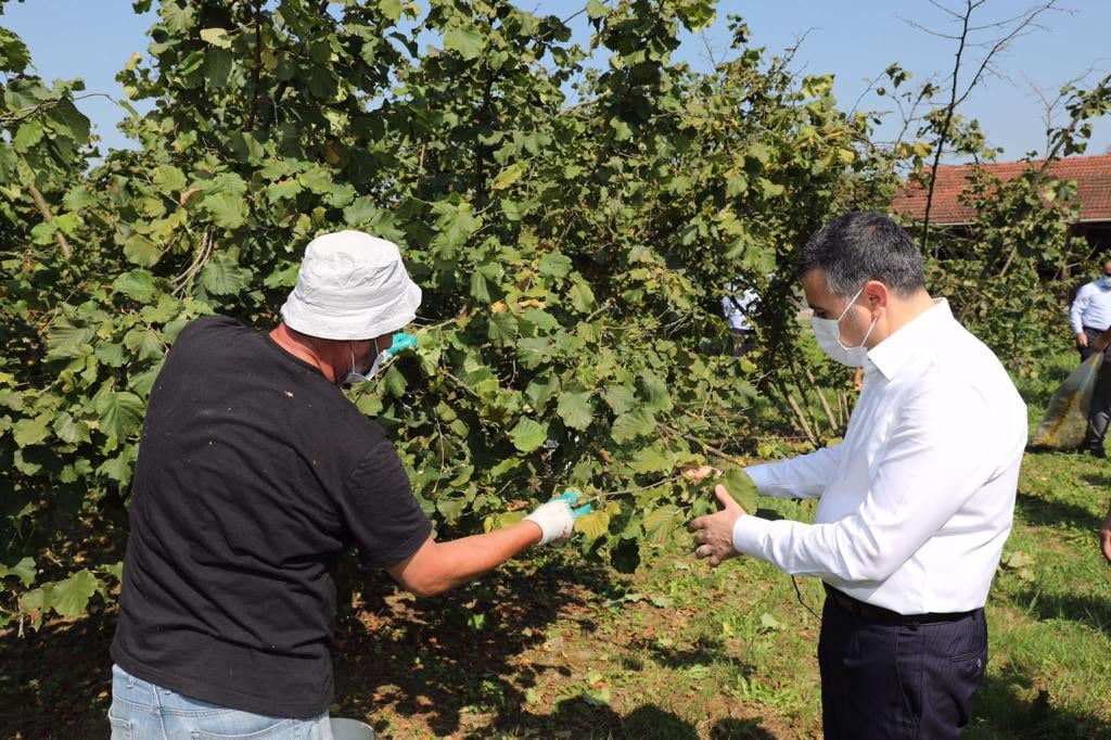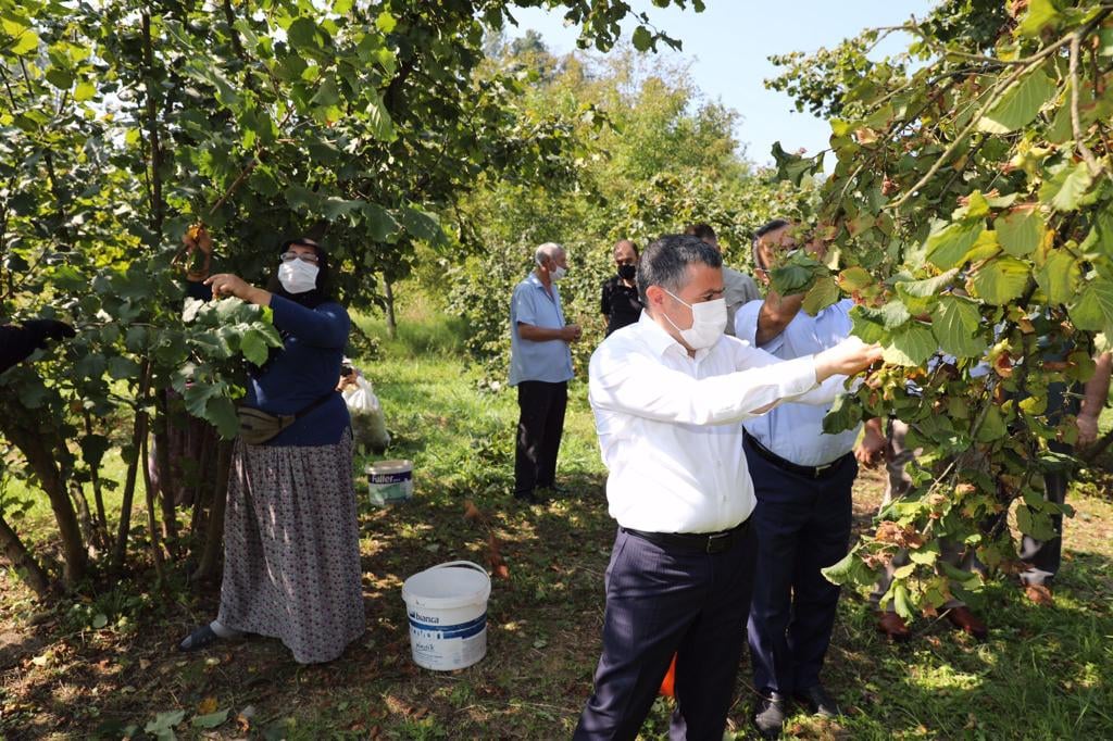Düzce Valisi Cevdet Atay, Küçük Mehmetler köyünde fındık üreticilerini ve hasat yapan işçileri ziyaret ederek fındık topladı.