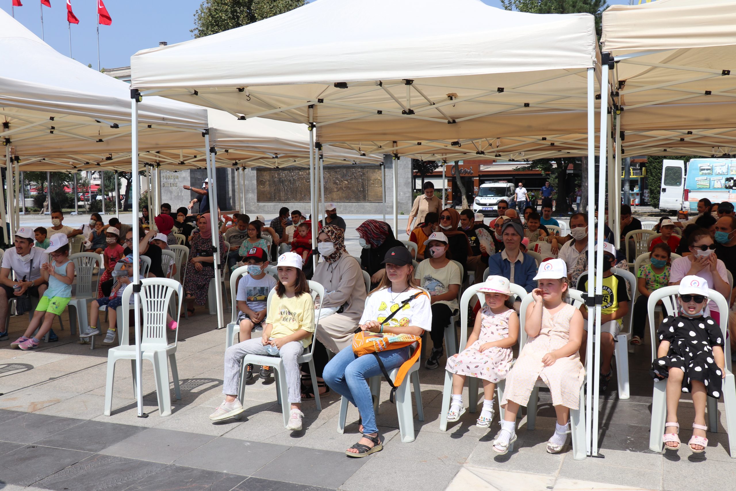 Düzce Belediyesi Kültür İşleri Müdürlüğü tiyatro oyunu için şehrin birçok noktasından ücretsiz araçlar kaldırılırken müdürlük ekipleri, sanatseverlerin rahatlığı su ve şapka dağıttı. Ayrıca Düzcelilerin güneşten etkilenmemesi için de önlem alındı.
