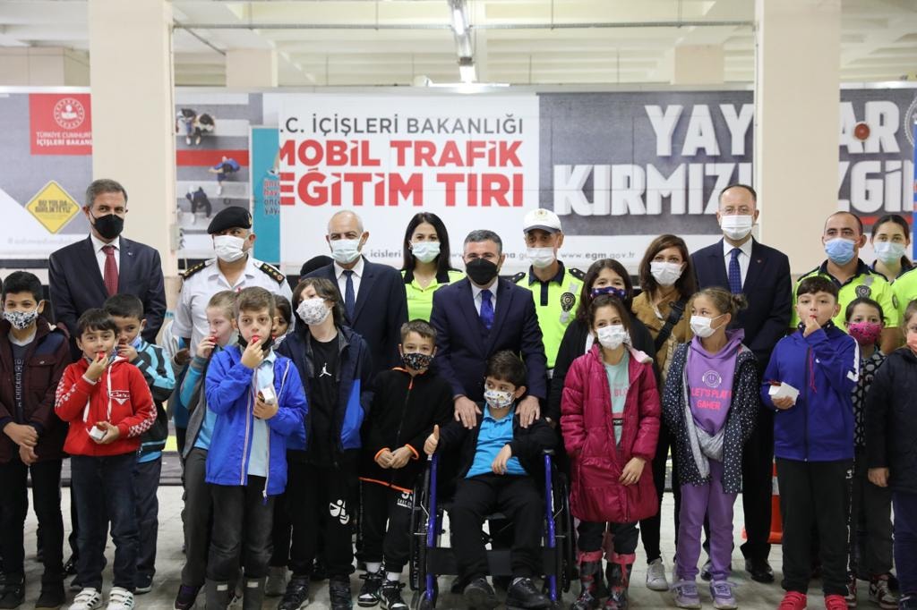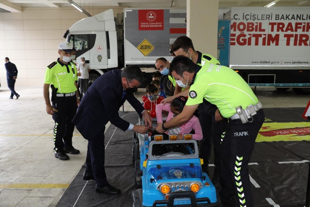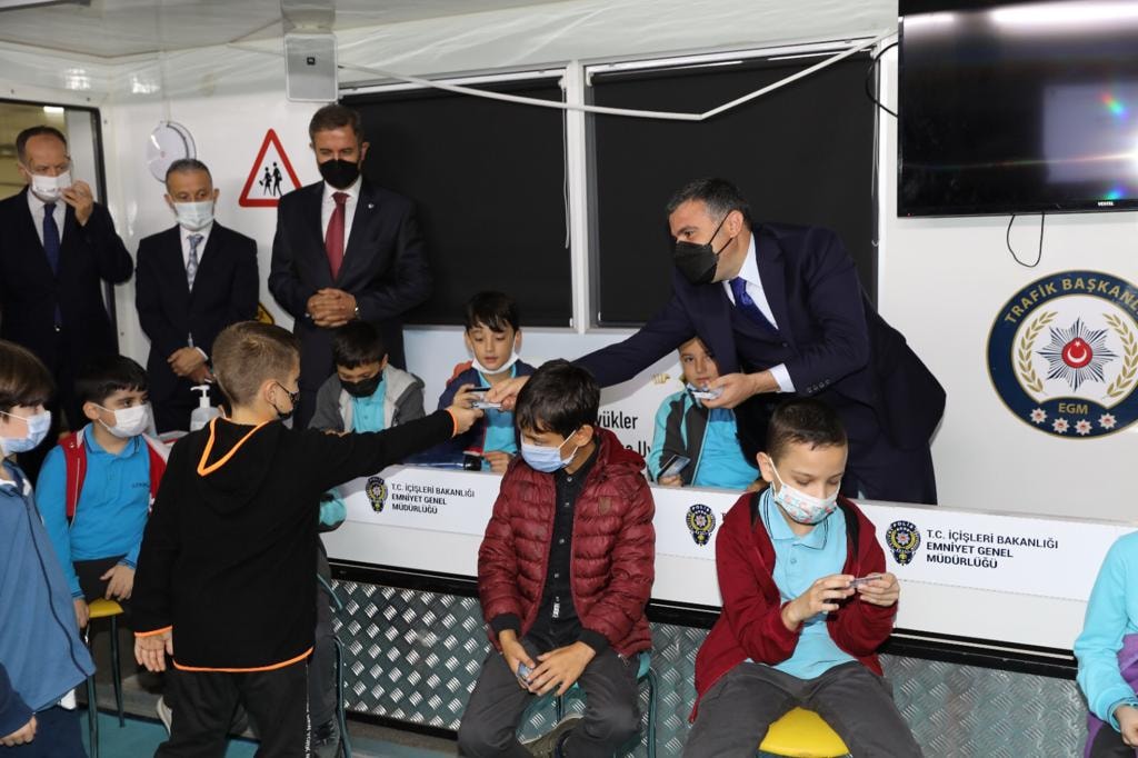 Düzce Valisi Cevdet Atay, Düzce’de başlatılan ilkokul öğrencilerine trafik eğitimi tırını ziyaret ederek, minik öğrencilere trafik dedektif kartı dağıttı.
