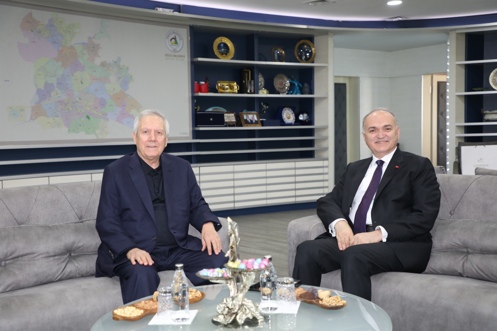 Düzce Belediye Başkanı Dr. Faruk Özlü, Fenerbahçe Spor Kulübünün 20 yıl başkanlığını yapan, çocukluğu Düzce’de geçen Aziz Yıldırım’ı ağırladı. Düzce’deki yatırımları inceleyen Yıldırım, Başkan Özlü’ye kente yaptığı yatırımlardan dolayı teşekkür etti.