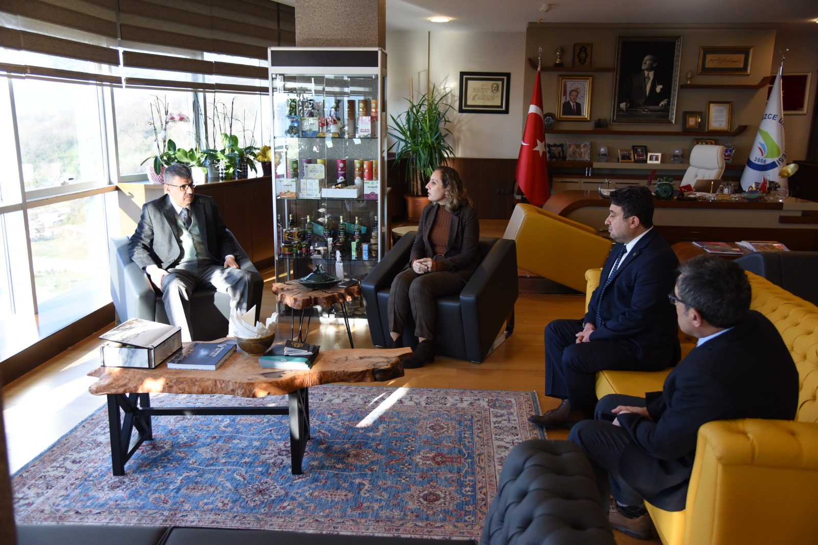 İlk olarak Düzce Üniversitesi Rektörü Prof. Dr. Nigar Demircan Çakar’ı makamında ziyaret eden Pamukkale Üniversitesi Rektörü Prof. Dr. Ahmet Kutluhan, karşılıklı görüş alışverişinde bulunarak iş birliği imkanlarını istişare etti. Ziyarette, Düzce Üniversitesi Rektör Yardımcıları Prof. Dr. İdris Şahin ve Prof. Dr. Mehmet Akif Öncü de yer aldı.