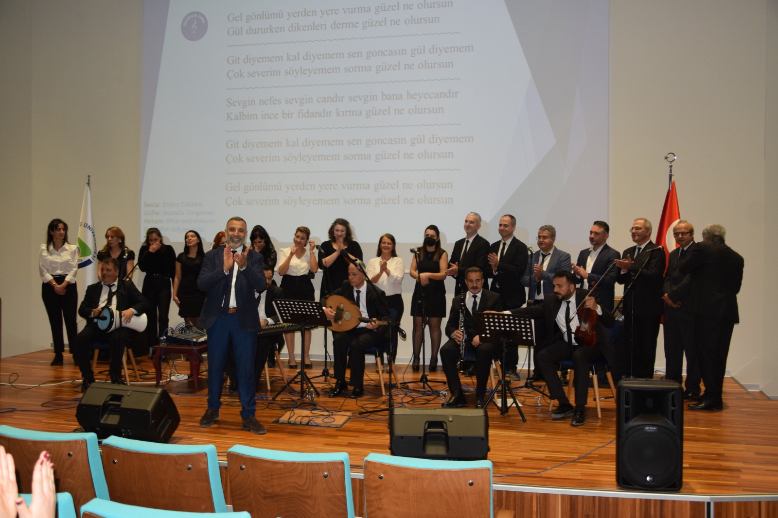 Akademik ve idari personellerden oluşan Düzce Üniversitesi Tıp Fakültesi korosu, Tıp Fakültesi Göz Hastalıkları Anabilim Dalı Başkanı Prof. Dr. Murat Kaya şefliğinde Klasik Türk Müziği’nin nihavend makamından seçme eserler seslendirdi. Türk müziğinin eşsiz eserlerini dinleme keyfi yaşayan konuklar, koro ekibine de alkışları ile eşlik etti.