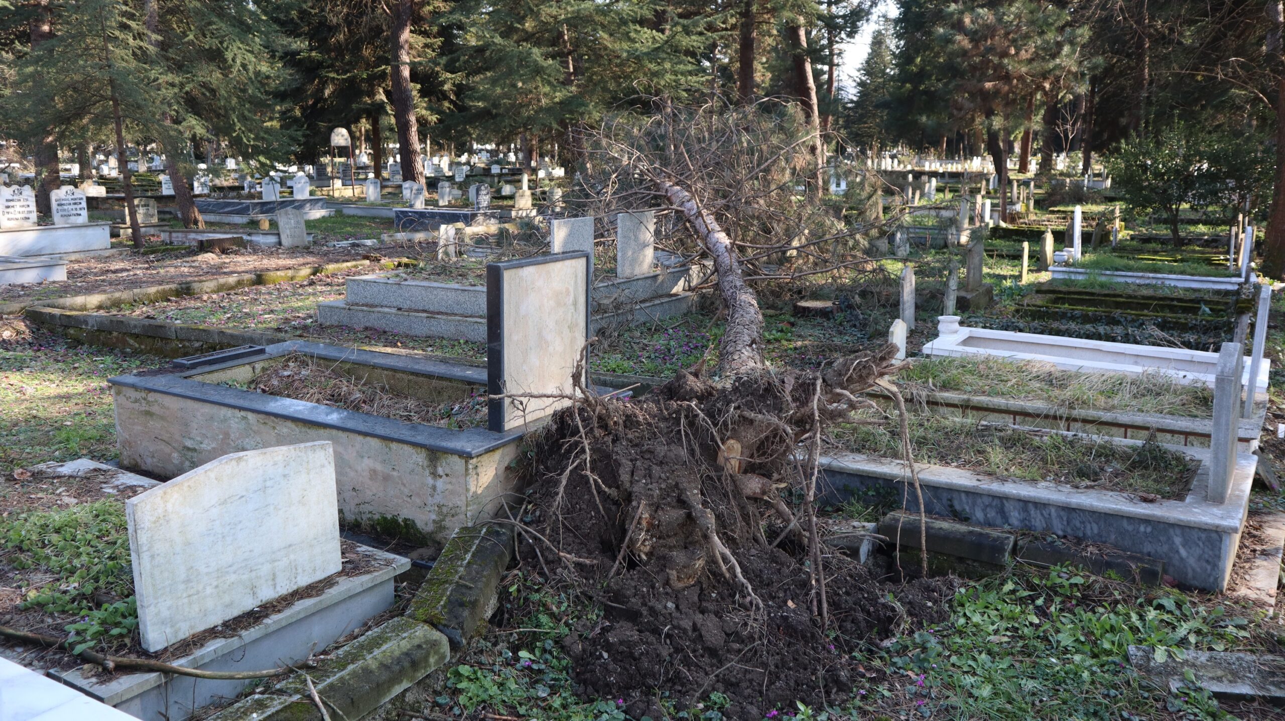Basın açıklamasının ardından mezarlıklarda yapılan çalışmalar basın mensuplarına anlatılırken yıkılan ağaçların kırdığı mezarlıklar gözler önüne serildi.