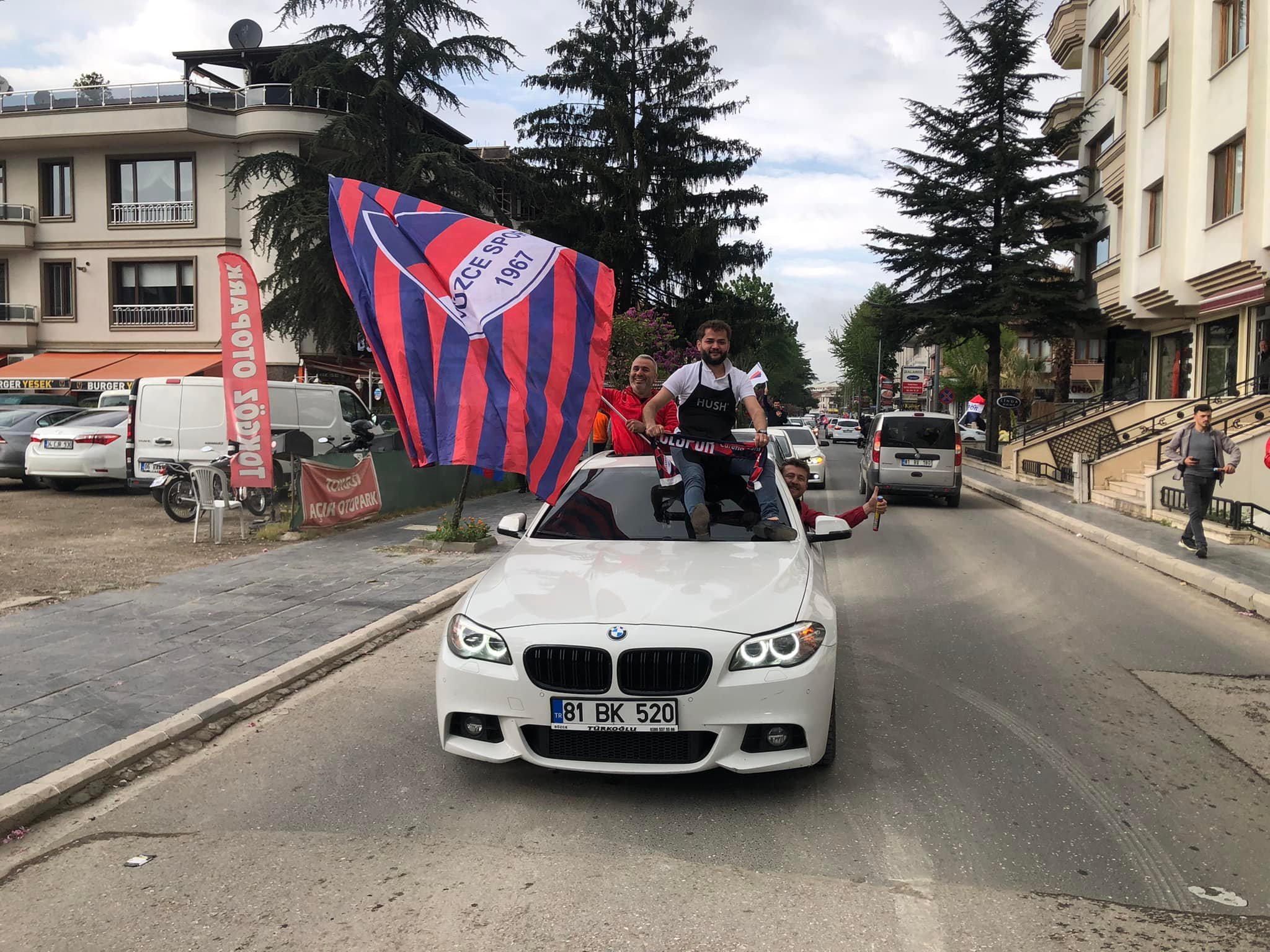 Düzcespor’un 37. Haftada deplasmanda Yomraspor’u 2-1 yenerek ligin bitmesine bir hafta kala şampiyonluğunu garanti etmesinin ardından yüzlerce taraftar sevinç kutlamasında bulundu. Düzcespor- Yomraspor maçının bitiş düdüğünün çalınmasının ardından İstanbul Caddesi’ne çıkan taraftarlar kımızı laciverti bayrak, flamalarıyla ve yaktıkları şampiyonluk meşalesiyle slogonlar eşliğinde Anıt Parka yürüdü. Düzcespor’un şampiyonluk kutlamalarına yaşlı, genç ve ailelerinde katılımıyla renkli görüntüler oluştu.