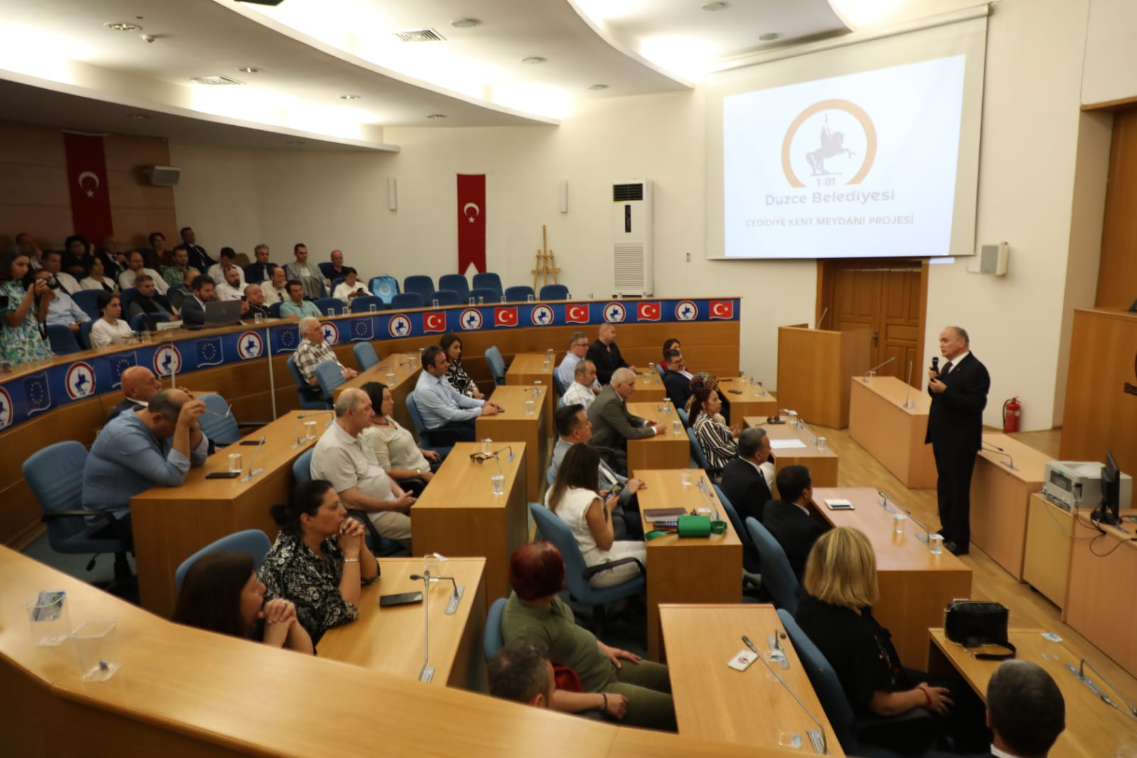 Cedidiye Kent Meydanı Projesi tanıtım toplantısına Düzce Belediye Başkanı Dr. Faruk Özlü başta olmak üzere başkan yardımcıları, birim müdürleri, meclis üyeleri, siyasi parti temsilcileri, Vakıflar Bölge Müdürü, hak sahipleri ve şehrin ileri gelen isimleri katıldı.