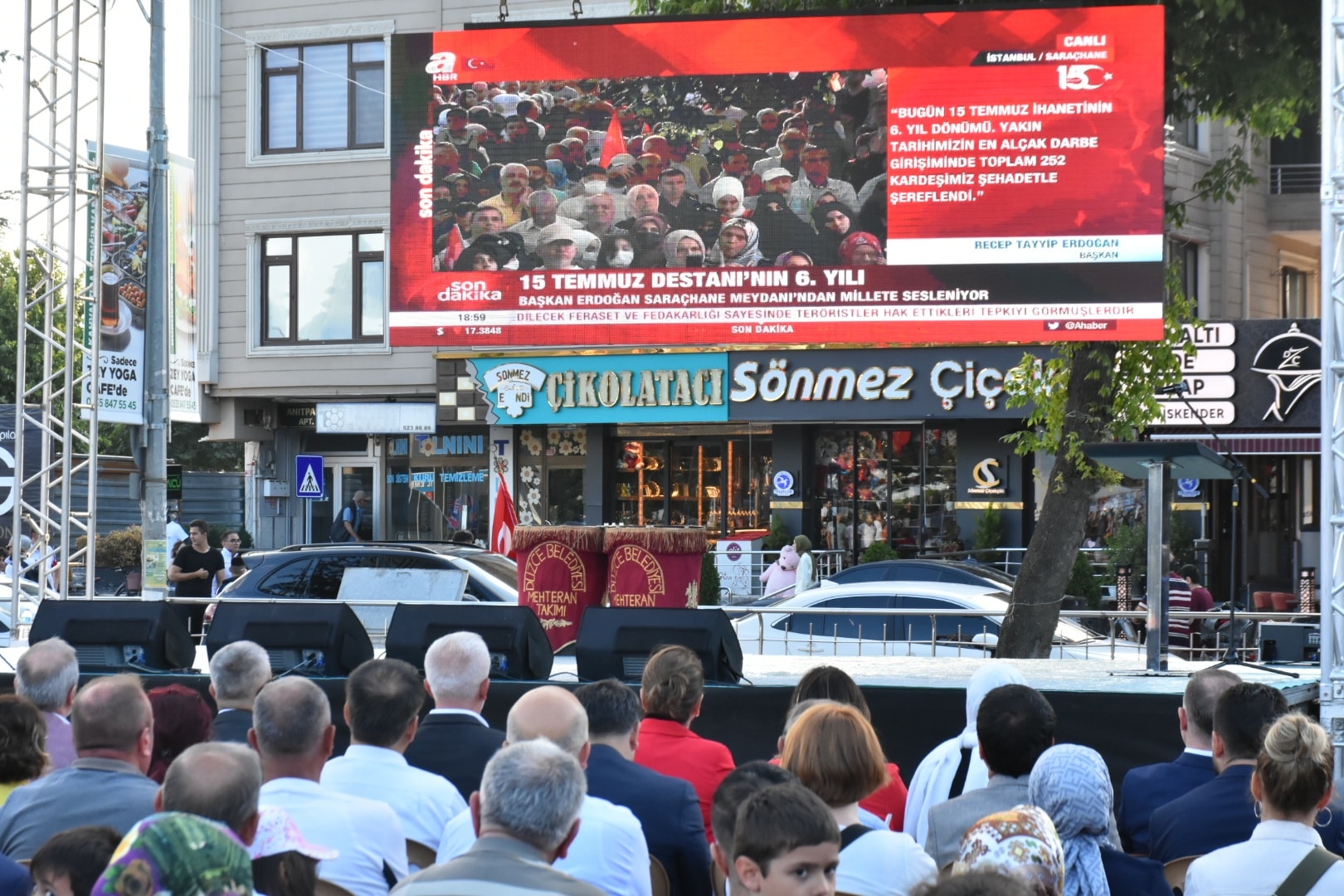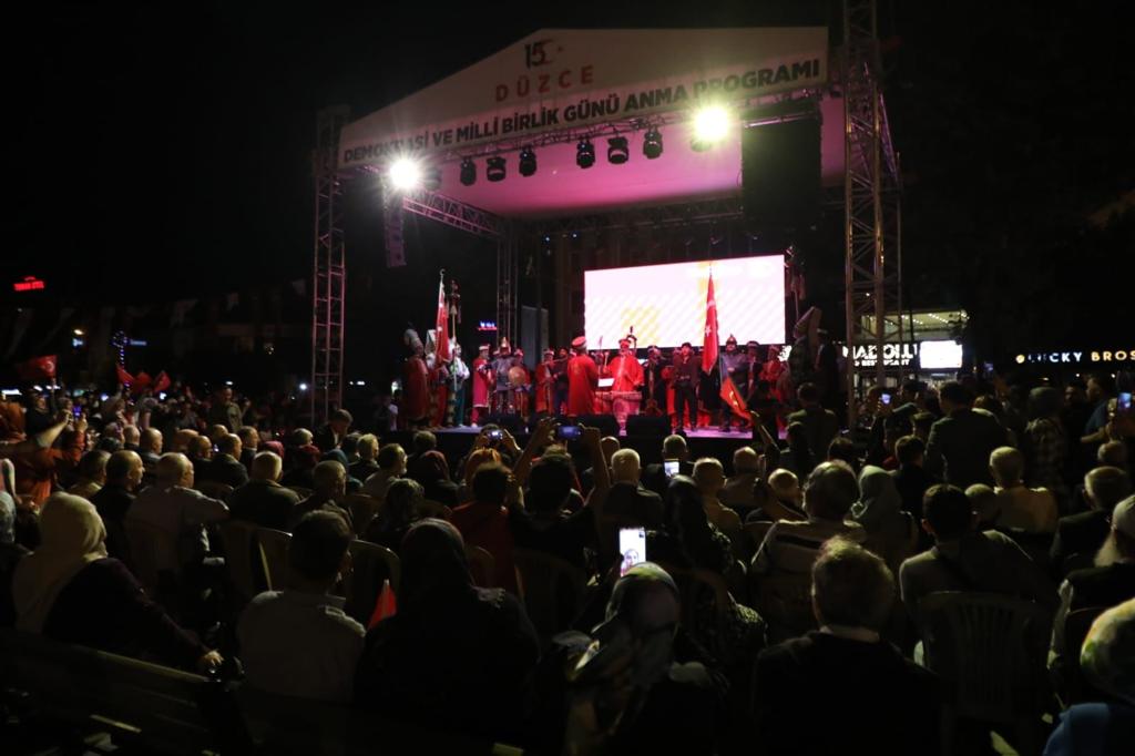 Düzce Valisi Cevdet Atay, Düzce Belediye Başkan Vekili Hüdaver Gösterişli, Belediye Başkan Yardımcıları, AK Parti Genel Merkez Kadın Kolları Başkanı Ayşe Keşir, Milletvekilleri, siyasi parti temsilcileri, STK temsilcileri ve vatandaşların hazır bulunduğu Anıtpark meydanında Cumhurbaşkanı Recep Tayyip Erdoğan’ın Saraçhane’deki miting alanından yaptığı konuşma canlı olarak verildi.