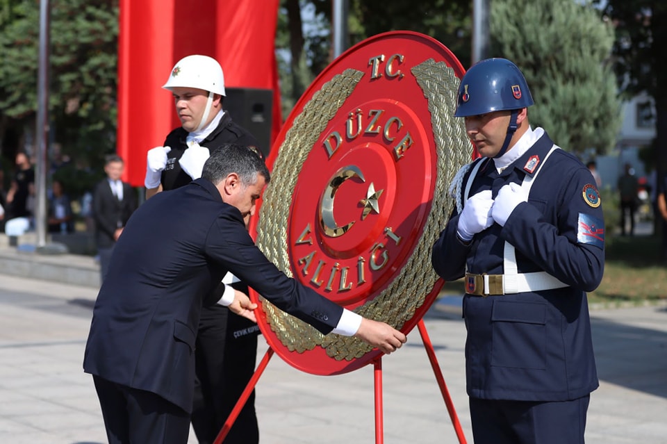 30 Ağustos zafer Bayramı Düzce’de Kent Meydanında Atatürk Anıtına çelenklerin konulmasıyla başladı. Vali Cevdet Atay, Belediye Başkan Yardımcısı Hüdaver Gösterişli çelenk koydu. Ardından saygı duruşu ve İstiklal Marşının okunmasıyla tören sona erdi.