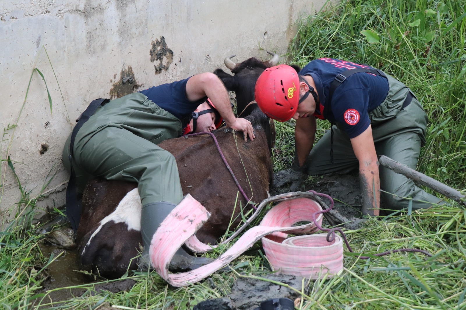 İhbar üzerine bölgeye gelen itfaiye ekipleri, halat bağladıkları vinç yardımıyla ineği bulunduğu yerden çıkardı.