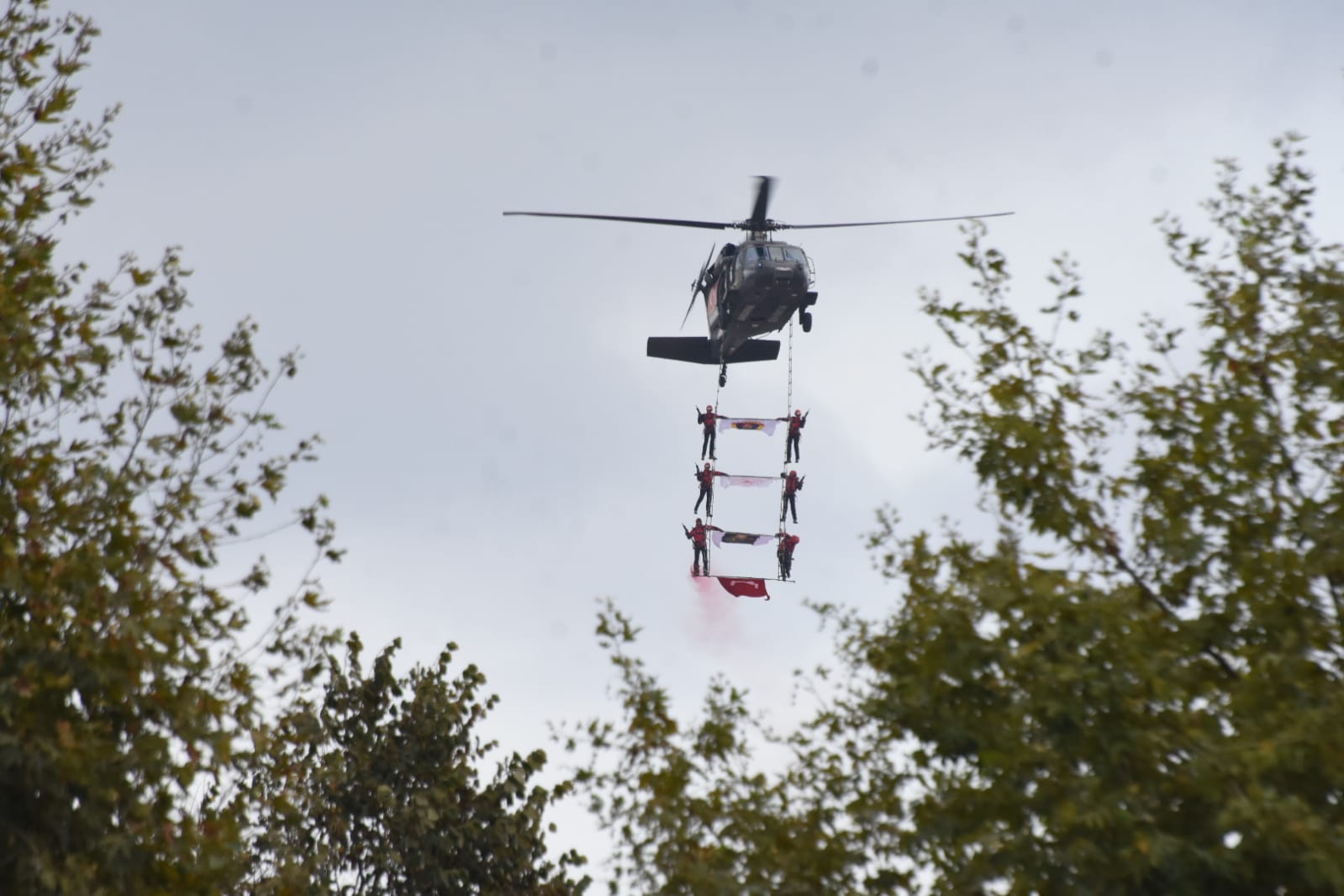İç güvenlik operasyonları, terörle mücadele harekâtları ve arama-kurtarma faaliyetlerinde önemli bir rol üstlenen jandarma hava askerleri, helikopter kullanmadaki tecrübe ve yeteneklerini çelik kanatlara asılı olarak gösterdi. Düzce’nin etrafında tur atan kahraman askerler Türk Bayrağı’nı Düzce semalarında gezdirdi.