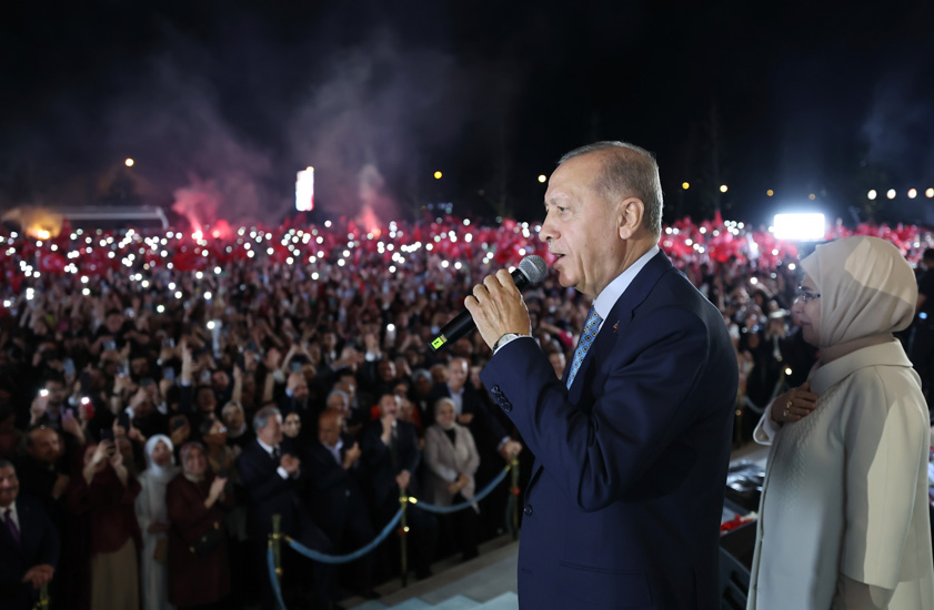 Cumhurbaşkanı Recep Tayyip Erdoğan, Yüksek Seçim Kurulunca geçici sonuçlara göre cumhurbaşkanı seçildiğinin açıklanmasının ardından Cumhurbaşkanlığı Külliyesi’nde toplanan vatandaşlara hitap etti.