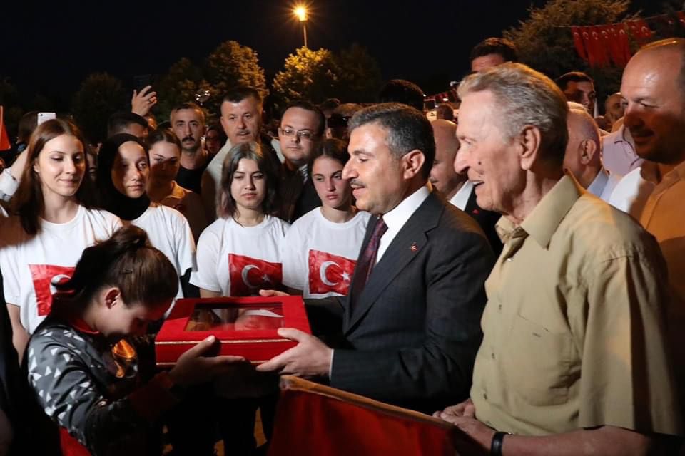 Programda Düzce Belediyesi Mehteran ekibi söylediği marşlarla vatandaşları coşturdu. Ardından Cumhurbaşkanı Sayın Recep Tayyip Erdoğan’ın 81 ile eş zamanlı olarak yaptığı konuşma izlendi. Etkinlikte Yıldızlar Halter Avrupa Şampiyonası’nda 3 Avrupa rekoru kırarak Avrupa Şampiyonu olan sporcumuz Yağmur Melek Şahin ve diğer sporcularımız “15 Temmuz Şehitleri Sancak Koşusu” ile Düzce Anıtpark Meydanı’na ulaştırılan Ay Yıldızlı sancağı Valimiz Sayın Cevdet Atay’a verdi.