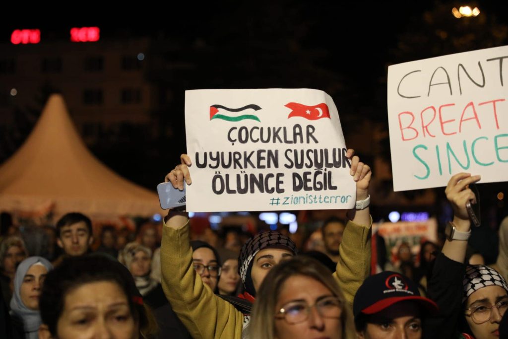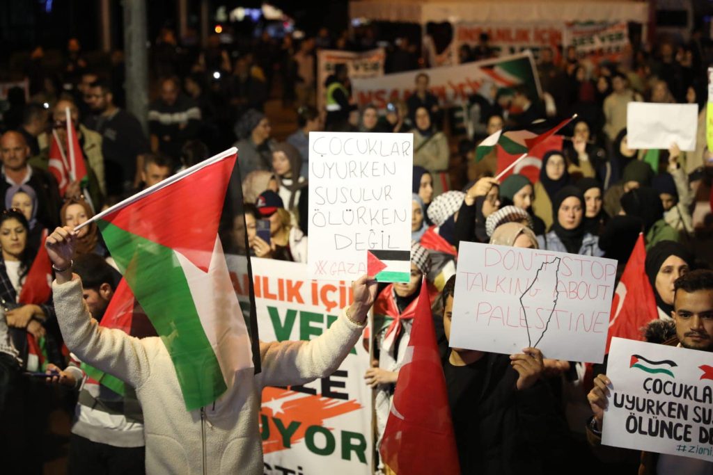 Cedidiye Meydanı’nda düzenlenen programa katılan vatandaşlar, “Özgür Filistin”, “İnsanlık için ses ver, Gazze ölüyor”, “Gazze’de su, yemek, elektrik, ilaç bitti”, “Çocuklar uyurken susulur, ölürken değil” yazılı pankartlar taşıdı, İsrail aleyhine sloganlar attı.