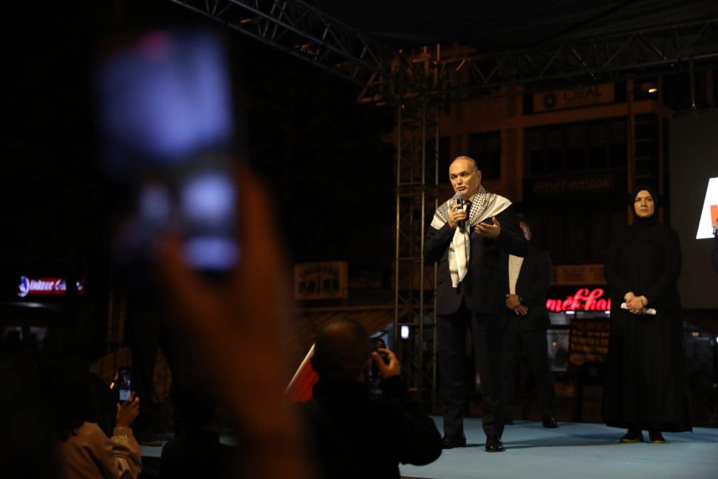 Belediye Başkanı Faruk Özlü, yaptığı konuşmada, İsrail’in bölgedeki amacının soykırım olduğunu belirterek, “O bölgeyi Filistinli kardeşlerimizden, Müslümanlardan arındırıp İsrail toprağı yapmak istiyorlar. Bakın İsrail Başbakanı yolsuzluk, hırsızlık, arsızlık suçlamalarıyla seçimi kaybetmeye aday bir adam. Şimdi bu adam çıkmış, ‘Öyle bir cevap vereceğiz ki Orta Doğu’da haritalar değişecek.’ diyor. Demek ki bir plan var ve bu planı sen uyguluyorsun. Sadece Filistin değil sırada Lübnan var. Sırada Orta Doğu’nun haritasının değiştirilmesine gidecek kadar bir süreç olduğunu görüyoruz.” ifadelerini kullandı.