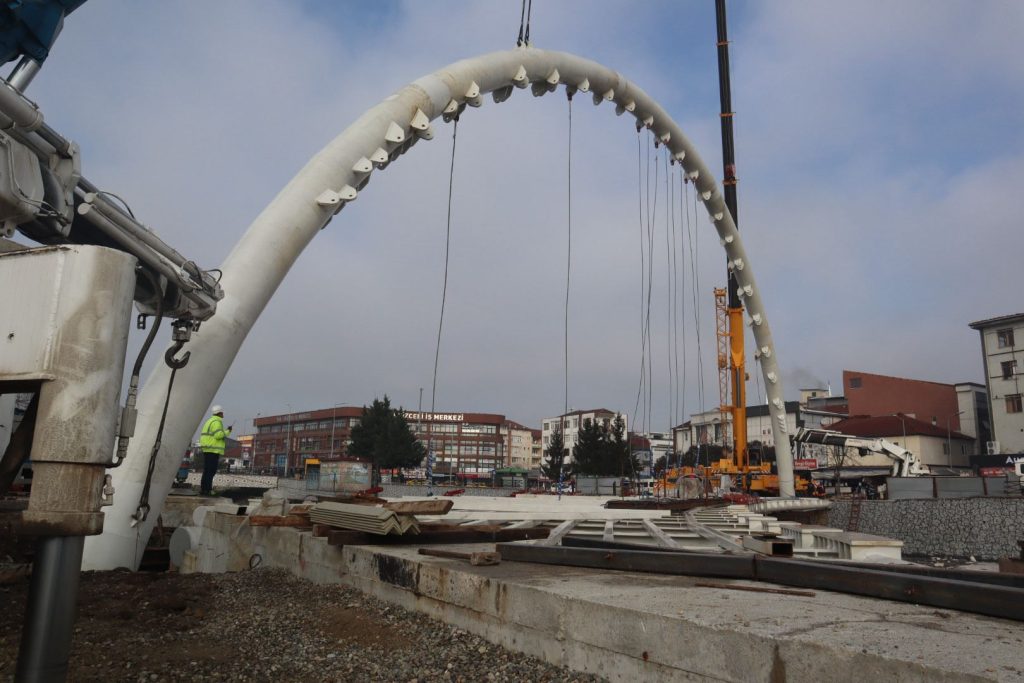 Şehre yeni bir kimlik kazandırmak için çaba gösteren Düzce Belediyesi, amfi ile beraber içerisinde restoran, büfe ve yay şeklindeki 2 aktif yaya köprüsünün bulunacağı projede köprü 1’in kemeri geçici halatlarla başarılı şekilde yerleştirildi.