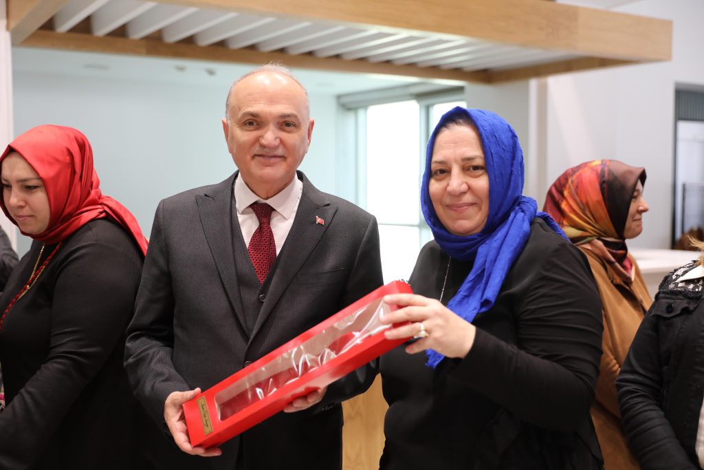 Kadınların her konuda giriştikleri işi emek ve özveri ile yaptıklarını belirten Başkan Özlü, kursiyerlerden eserleri hakkında bilgi aldı ve fotoğraf çektirdi. Kursiyerler de Başkan Özlü’ye hediye vererek serginin hazırlanması konusunda verdikleri destek dolayısıyla teşekkür etti.