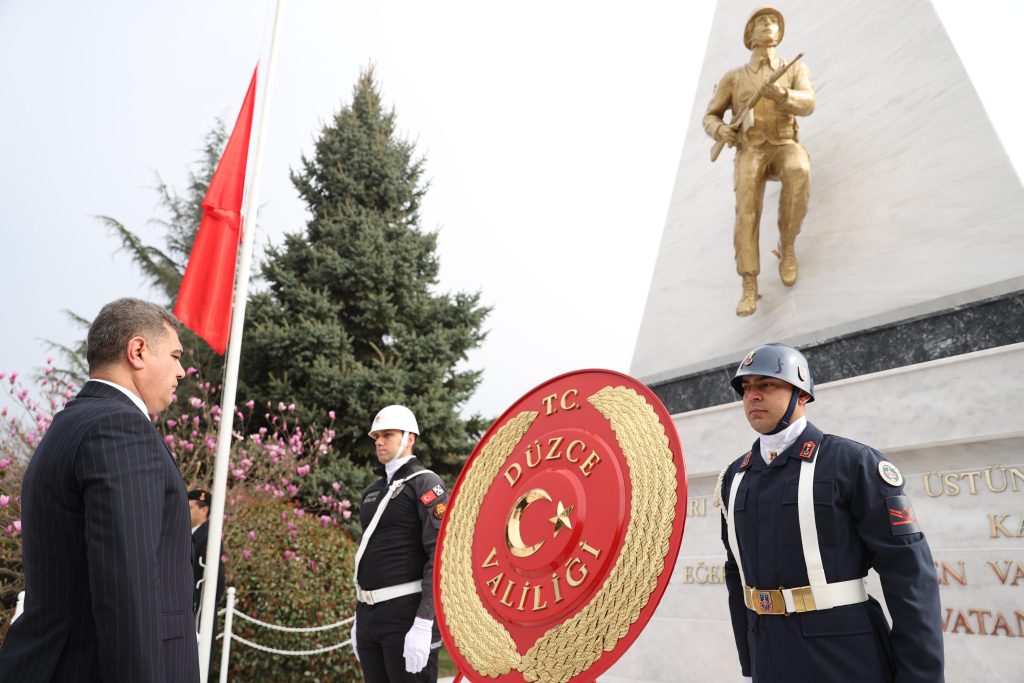 Düzce Valisi Selçuk Aslan, “Bugün 18 Mart Şehitler Gününü idrak etmenin onur ve gururunu yaşıyor, ‘Çanakkale geçilmez’ dedirten vatan için her bir cephede şehadet şerbetini içerek feda-i can eyleyen tüm şehitlerimizin huzurunda eğiliyorum. Tarihimizin her döneminde adını altın harflerle yazdıran tüm kahramanlar gibi sizlerde ilimizin tarihine adınızı altın harflerle yazdırdınız. Vatanımızın bağımsızlığı ile milli birlik ve beraberliğimiz adına sergilenen eşsiz kahramanlıklarla yazılan destanların her bir satırında emekleri olan aziz şehitlerimiz, milletimin gönlünde müstesna bir yere sahiptir. Bu vatan için şehit olmak ulaşabilecek en ulvi makamdır. Bu unvanla şereflenen kahramanlarımızın ve kıymetli ailelerinin hakkını ödeyemeyiz. Bizler onları her daim başımızın tacı bilerek aziz hatıralarını yüreğimizde minnetle taşıyoruz. Bu duygularla Çanakkale Zaferi’nin 109. Yıldönümünü kutluyor, 18 Mart Şehitler Günü’nde bu aziz toprakları bize emanet eden tüm şehitlerimizi ve başta Gazi Mustafa Kemal Atatürk olmak üzere tüm kahramanlarımızı rahmet ve şükranla anıyorum. Ruhlarınız şad, mekanlarınız ali olsun” dedi.