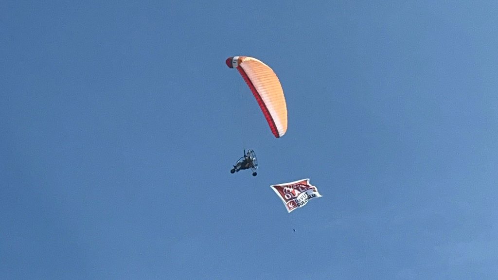 Sabah saatlerinde, Paramator ile Düzce semalarında pankart açan Güloğlu, “Birlik Olalım” yazısıyla dikkatleri üzerine çekti. Paramator ile Düzce semalarında dolaşan afiş, gökyüzüne renk kattı. Düzceliler, merakla gökyüzüne bakarak ilk bakışta ne olduğunu anlamaya çalıştı.