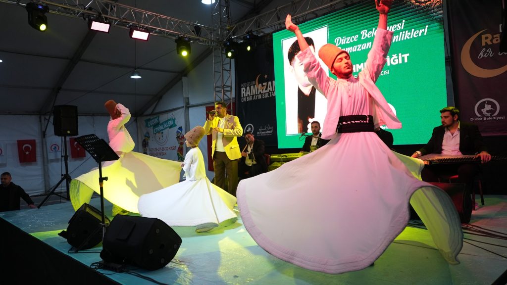 Düzce Belediyesi ev sahipliğinde Cedidiye Meydanı’nda kurulan çadırda düzenlenen Ramazan Ayı etkinlik takvimi kapsamında birbirinden ünlü isimler Düzcelilerle buluştu. Teravih Namazı sonrası Tasavvuf Sanatçısı Mehmet Yiğit’i ağırlayan çadırı dolduran Düzceliler birbirinden güzel ilahilere eşlik etti. Çocuklar için de ikramların olduğu organizasyonda aynı zamanda Semazen gösterileri de düzenlendi.