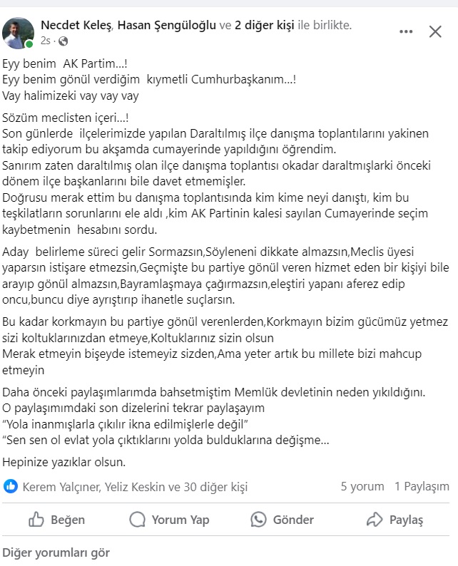Ak Parti Cumayeri eski ilçe Başkanı Nejdet Keleş, İl Başkanı Hasan Şengüloğlu ve yönetimini hedef alarak ilçede gerçekleşen daraltılmış ilçe toplantısına partide daha önce görev yapmış isimlerin davet edilmemesine tepki göstererek ” Aday belirleme süreci gelir Sormazsın,Söyleneni dikkate almazsın,Meclis üyesi yaparsın istişare etmezsin,Geçmişte bu partiye gönül veren hizmet eden bir kişiyi bile arayıp gönül almazsın,Bayramlaşmaya çağırmazsın,eleştiri yapanı aferez edip oncu,buncu diye ayrıştırıp ihanetle suçlarsın. Bu kadar korkmayın bu partiye gönül verenlerden,Korkmayın bizim gücümüz yetmez sizi koltuklarınızdan etmeye, Koltuklarınız sizin olsun. Merak etmeyin bişeyde istemeyiz sizden,Ama yeter artık bu millete bizi mahcup etmeyin. ” dedi.