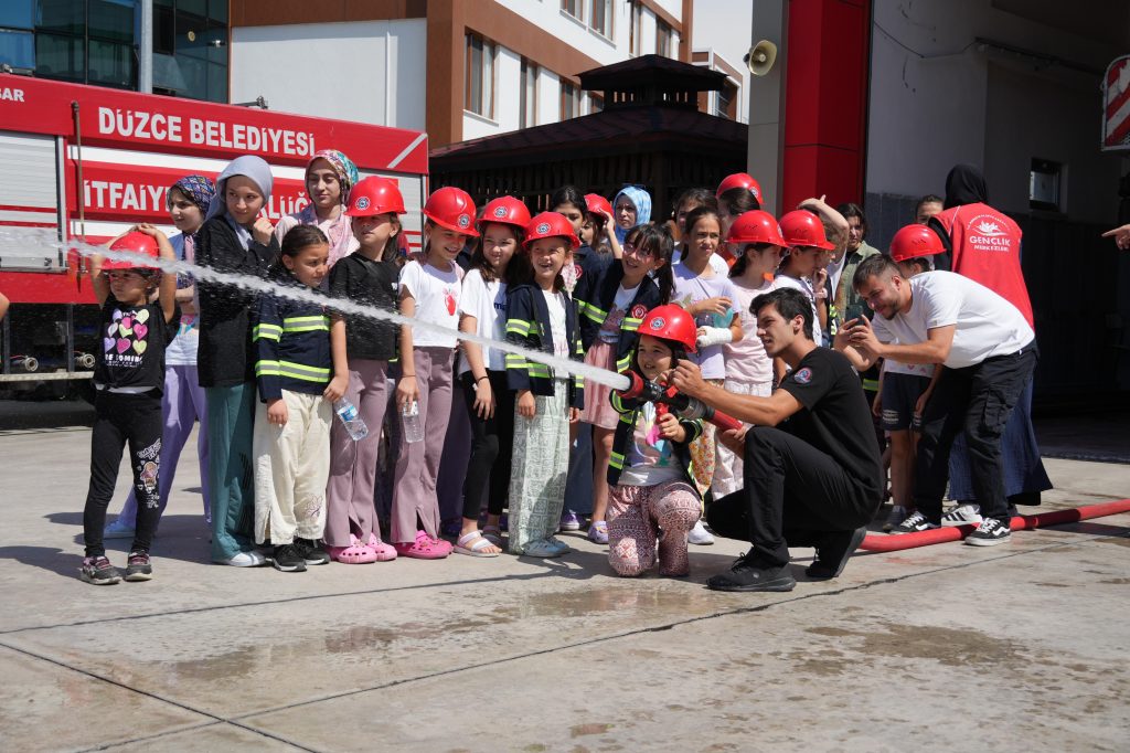 Minik itfaiyeciler yangın hortumu ile su sıkarak hem eğlendi hem de yangına nasıl müdahale edildiğini uygulamalı olarak öğrendi. Program sonunda geziye katılan çocuklara ‘Minik İtfaiyeci Başarı Belgesi’ verildi.