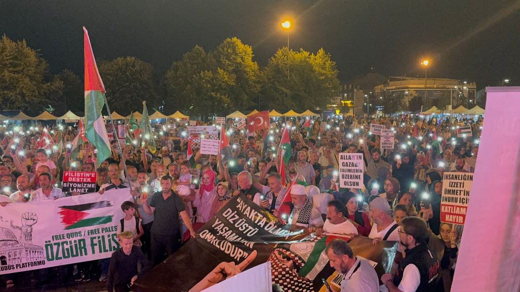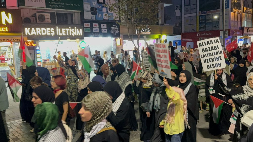 İsrail’in Gazze’deki saldırılarını protesto etmek ve İran’ın başkenti Tahran’da suikasta uğrayan Hamas Siyasi Büro Başkanı İsmail Heniyye’yi anmak için düzenlenen Büyük Gazze Yürüyüşü ve Filistin mitingi’ne katılmak üzere toplanan vatandaşlar Belediye önünden Anıtpark’a kadar sloganlar eşliğinde yürüdüler.