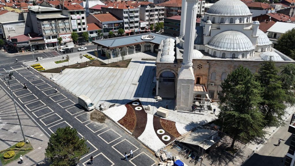 Tarihi meydanın konseptine ve cami mimarisine uygun olarak düzenlenen alanda cenaze araçlarının yeni döşenen taşlar üzerine çıkarılmaması için gerekli düzenlemenin yapıldığını ifade eden Özlü, çevre esnaf ve cami cemaati ile sohbet etmeyi ihmal etmedi.
