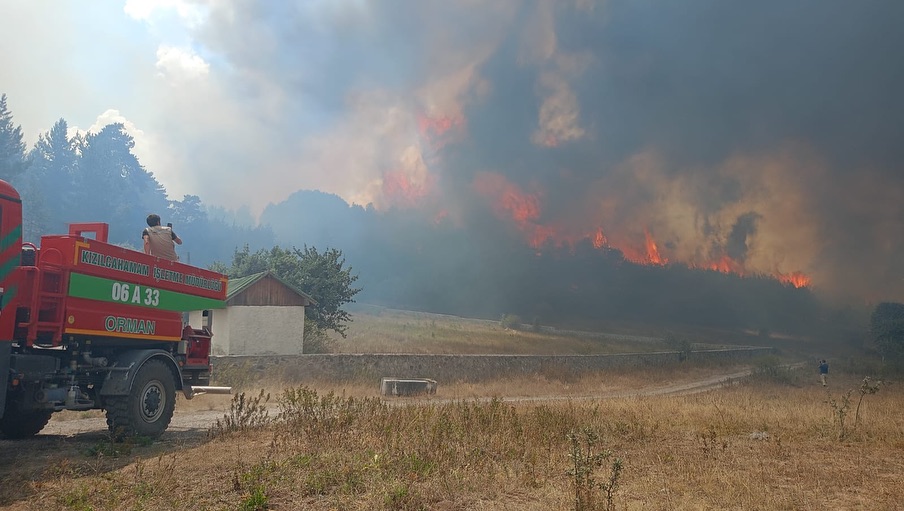 Yangın, sabah saatlerinde Ankara’nın Kızılcahamam ilçesinde meydana geldi. Kısa sürede büyüyen yangın, Bolu’nun Gerede ilçesine sıçradı. Ekipler, alevlere havadan ve karadan müdahaleyi sürdürürken, Bolu Valisi Erkan Kılıç yangın bölgesinden açıklama yaptı. Söndürme çalışmalarının devam ettiğini belirten Vali Kılıç, “Evlere de sirayet etmesi, son anda gelen yangın söndürme araçlarıyla engellendi. Şu anda yangın Kuzeydoğu tarafında devam diyor. Orada biraz riskimiz var diye değerlendiriyoruz. Bir vadi orada bulunuyor. Oraya da araçlarımız ulaşmıyor. Şu anda oraya dozerle beraber yol açılıp, ondan sonra itfaiye araçları ve arazözler o bölgede söndürme yapacak. Aynı zamanda bölgede çok şiddetli bir rüzgâr var. Bu rüzgâr da ister istemez mücadeleyi engelliyor.” dedi.