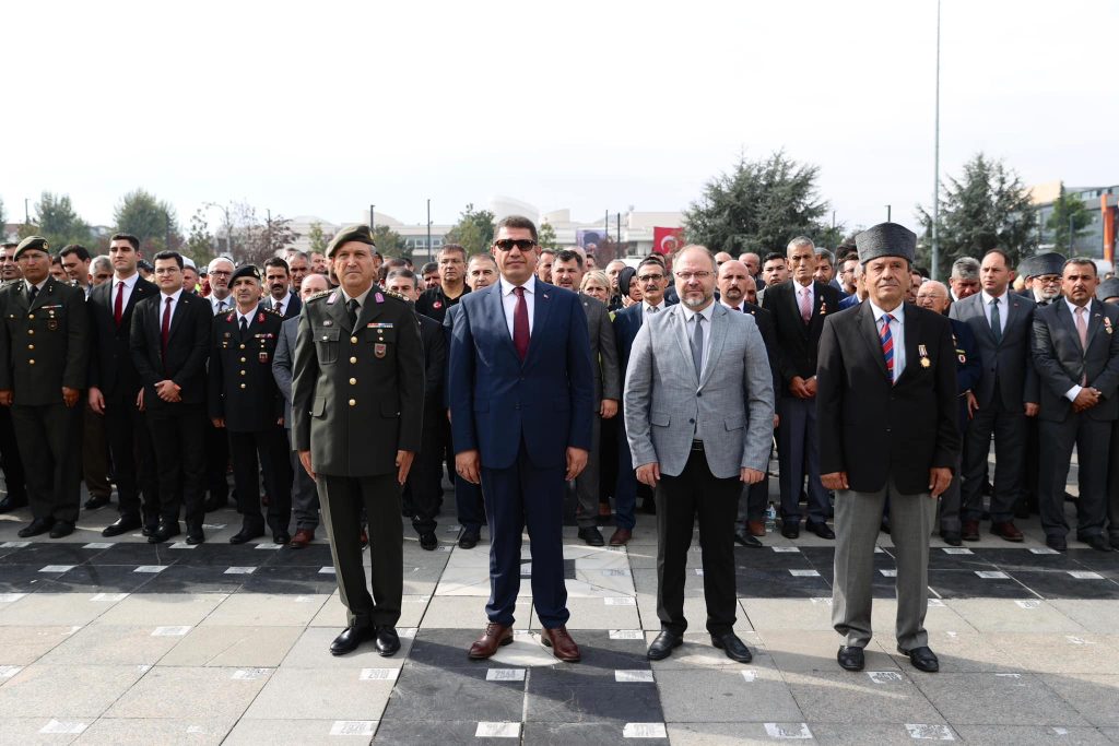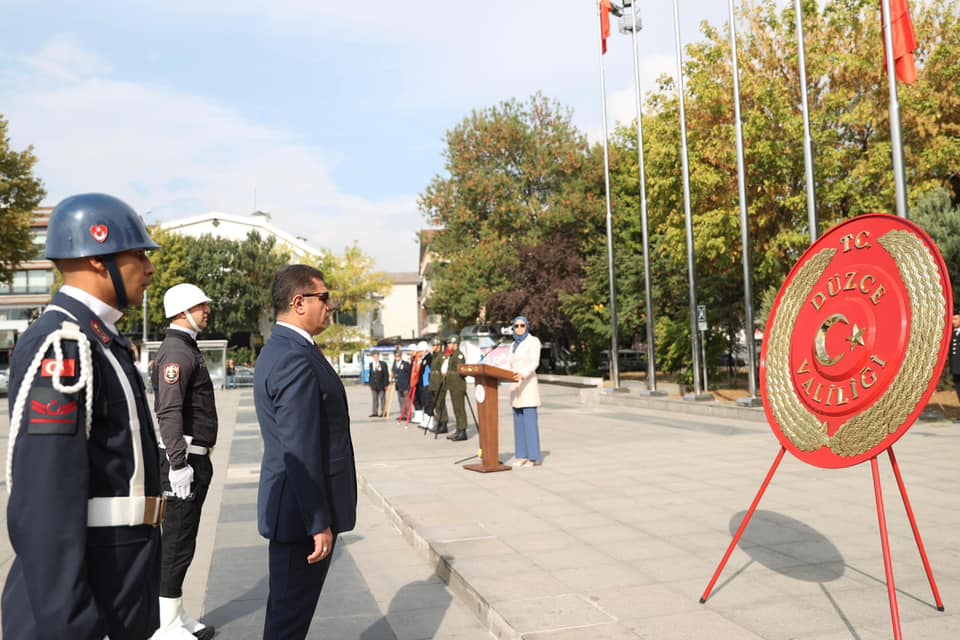 Tören kapsamında, Düzce Valiliği adına Vali Selçuk Aslan, Garnizon Komutanlığı adına Üsteğmen Süleyman Cihad Usanmaz, Düzce Belediyesi ve Muharip Gaziler Derneği temsilcileri Atatürk Anıtı’na çelenk bıraktılar.