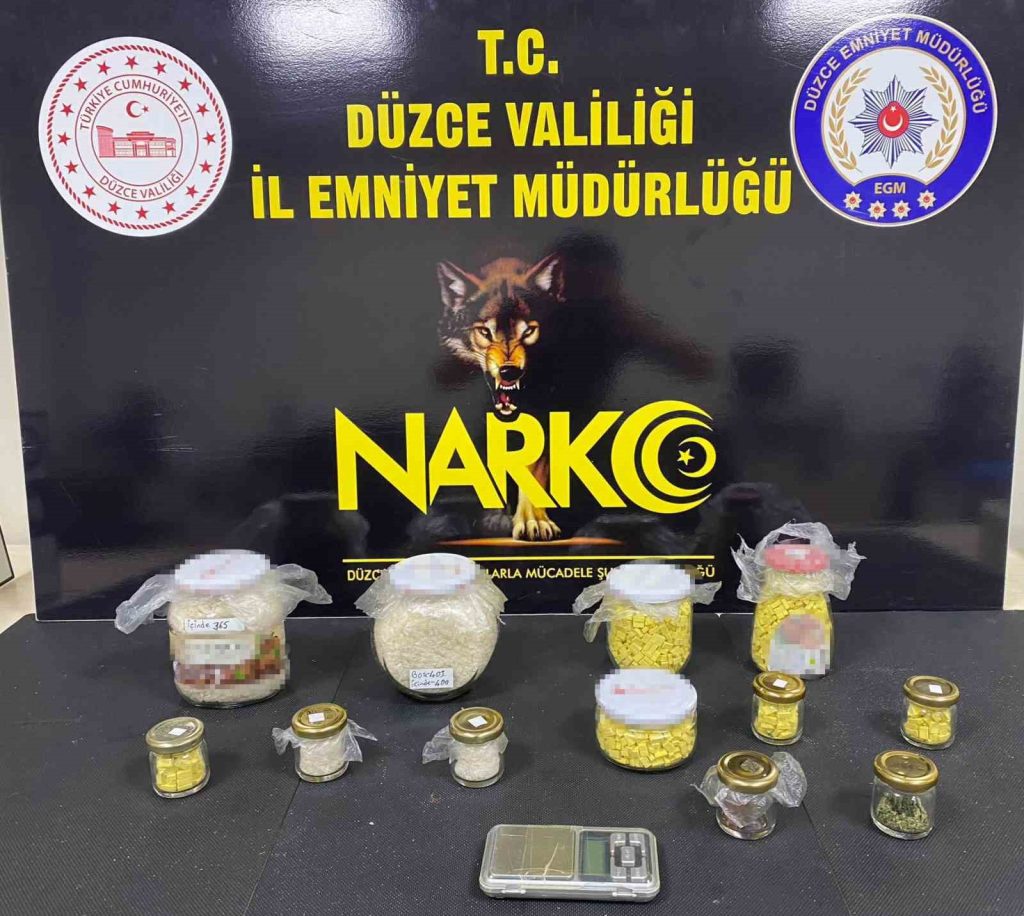 Düzce Cumhuriyet Başsavcılığının koordinesinde Narkotik Suçlarla Mücadele Şube Müdürlüğü ekiplerince Eski Bolu Caddesi üzerinde bulunan bir işletmede, uyuşturucu madde satışı yapıldığı yönünde bilgi elde edilmesi sonucu şüpheli T.Y.’ye (44) ait işyerine operasyon düzenlendi. Yapılan aramada; 800 gram Metamfetamin, 2 bin 628 adet Extacy Hap, 3 gram Sentetik Kannabinoid (Bonzai) ve 1 adet hassas terazi ele geçirildi.