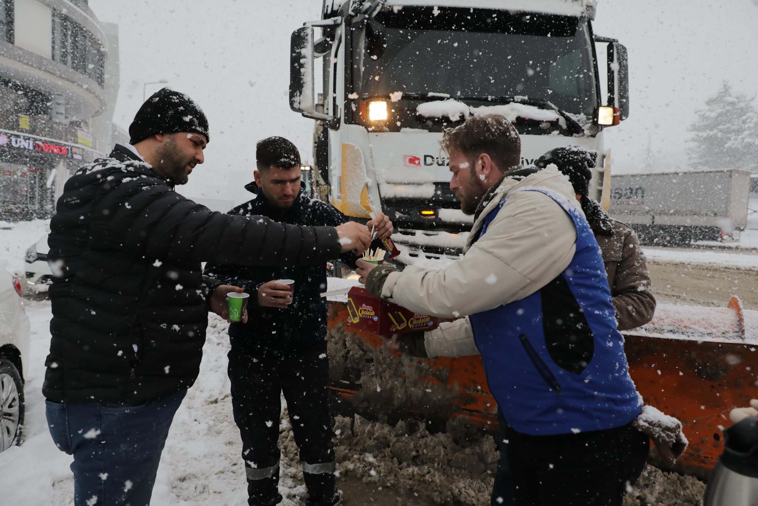 Sosyal Yardım İşleri Müdürlüğü tarafından yapılan sıcak içecek ikramı, ekiplerin motivasyonunu da artırarak, kar küreme ve yol açma çalışmalarına hızlı bir şekilde devam etmelerini sağladı.
