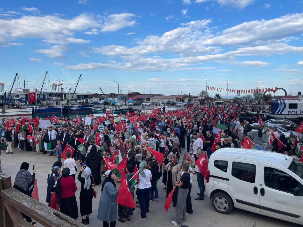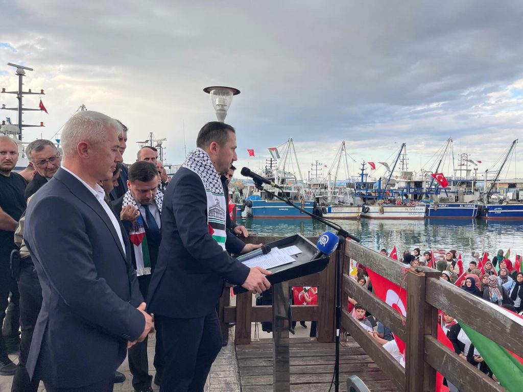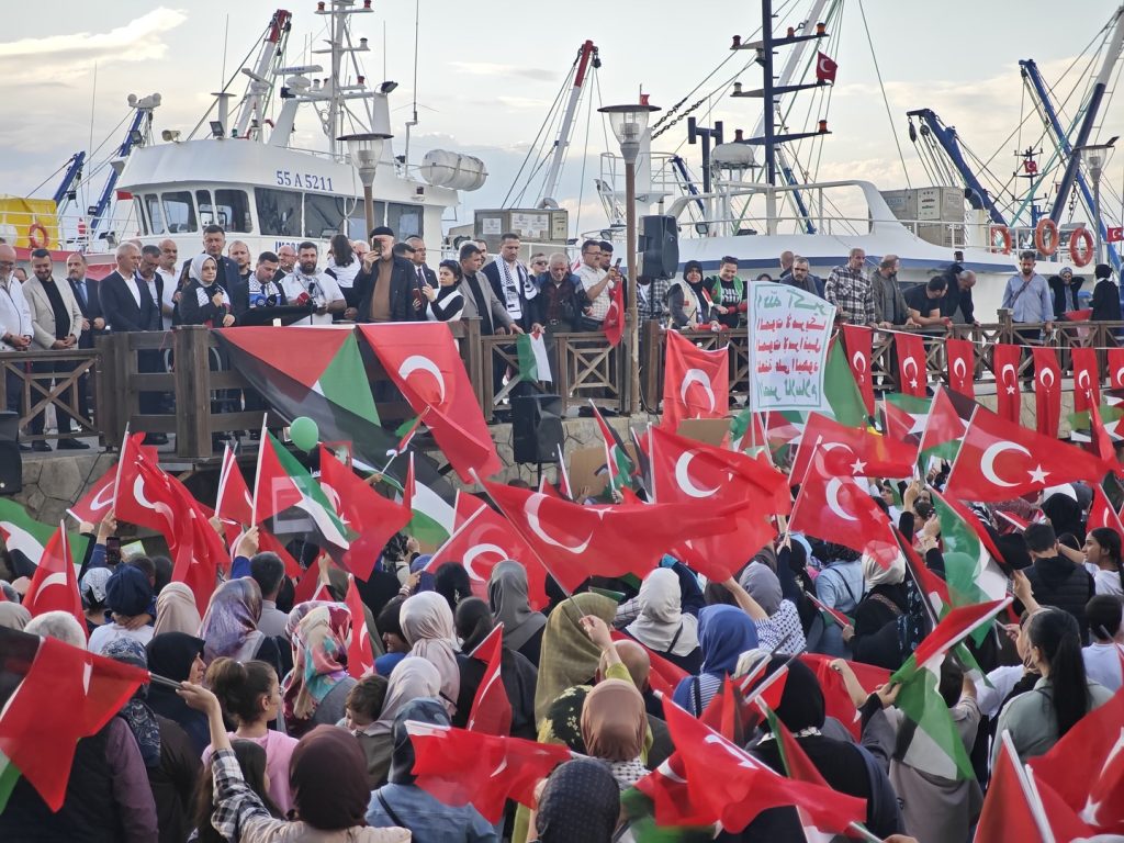 Konuşmaların ardından bölgedeki hava muhalefeti nedeniyle denize açılamayan balıkçılar, teknelerinin sirenlerini çalarak ellerinde Türkiye ve Filistin bayraklarıyla alanı dolduran kalabalığı selamladı.