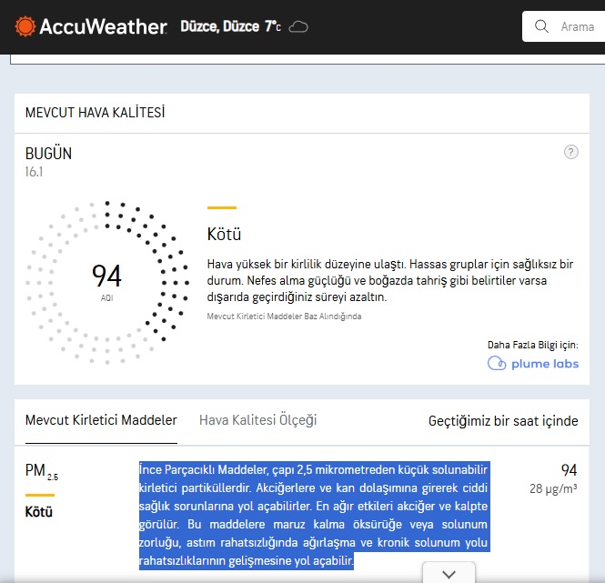 Düzce’de hava Kirliliği rekor kırarak  en yüksek sevilere ulaştı. Yetkililer, hassas gruplar için sağlıksız bir durum olduğunu ve nefes alma güçlüğü ve boğazda tahriş gibi belirtileri olanların dışarıda geçirdiği süreyi azaltmalarını ve dışarıya çıkmamalarını önerdi.