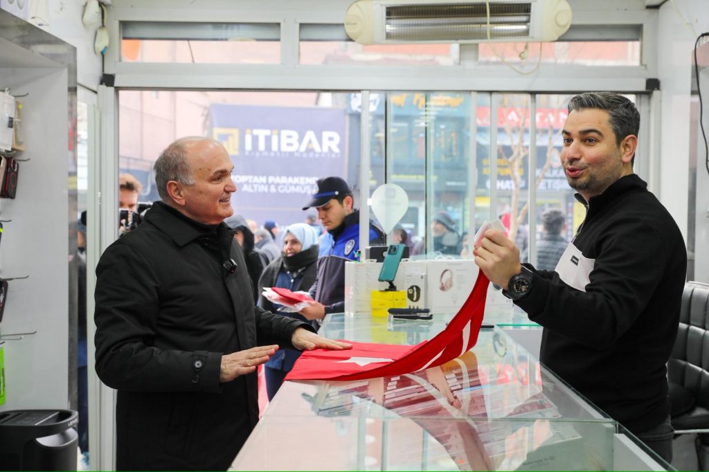 hassasiyetin nişanesi olarak esnaflara Türk Bayrağı dağıttı. Zabıta ekipleri ile İstanbul Caddesi, Gaziantep Caddesi, Spor Sokak’ta esnafları